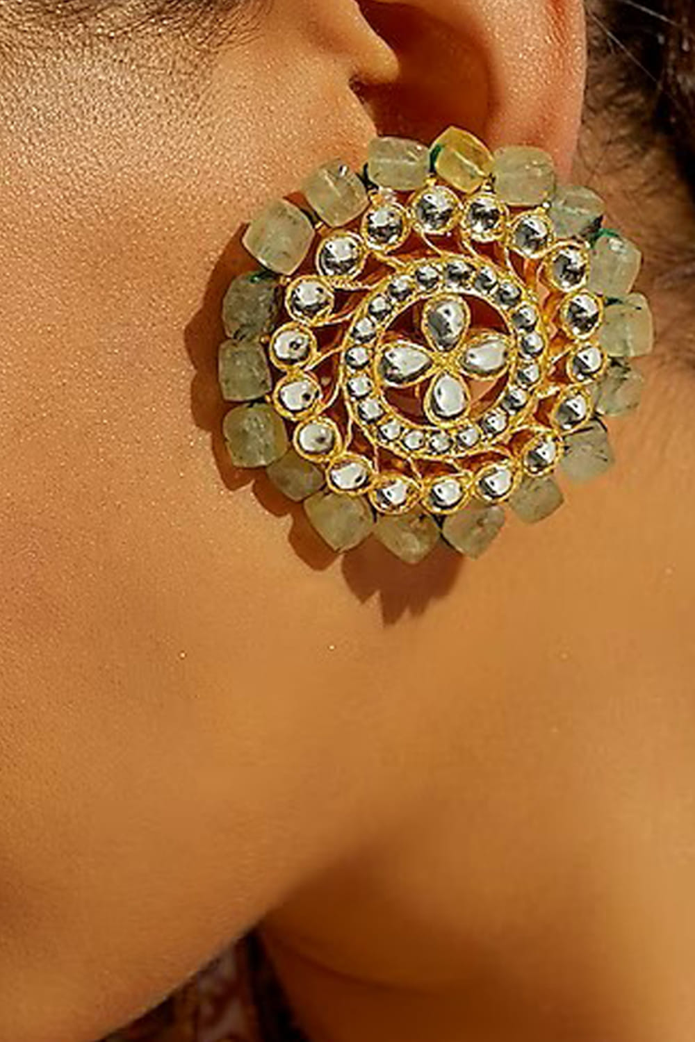 Aaharya designs this dazzling pair of studs in gold-plated silver adorned with semi-precious stone embellishments. Style them with a sharara set for a wedding occasion.