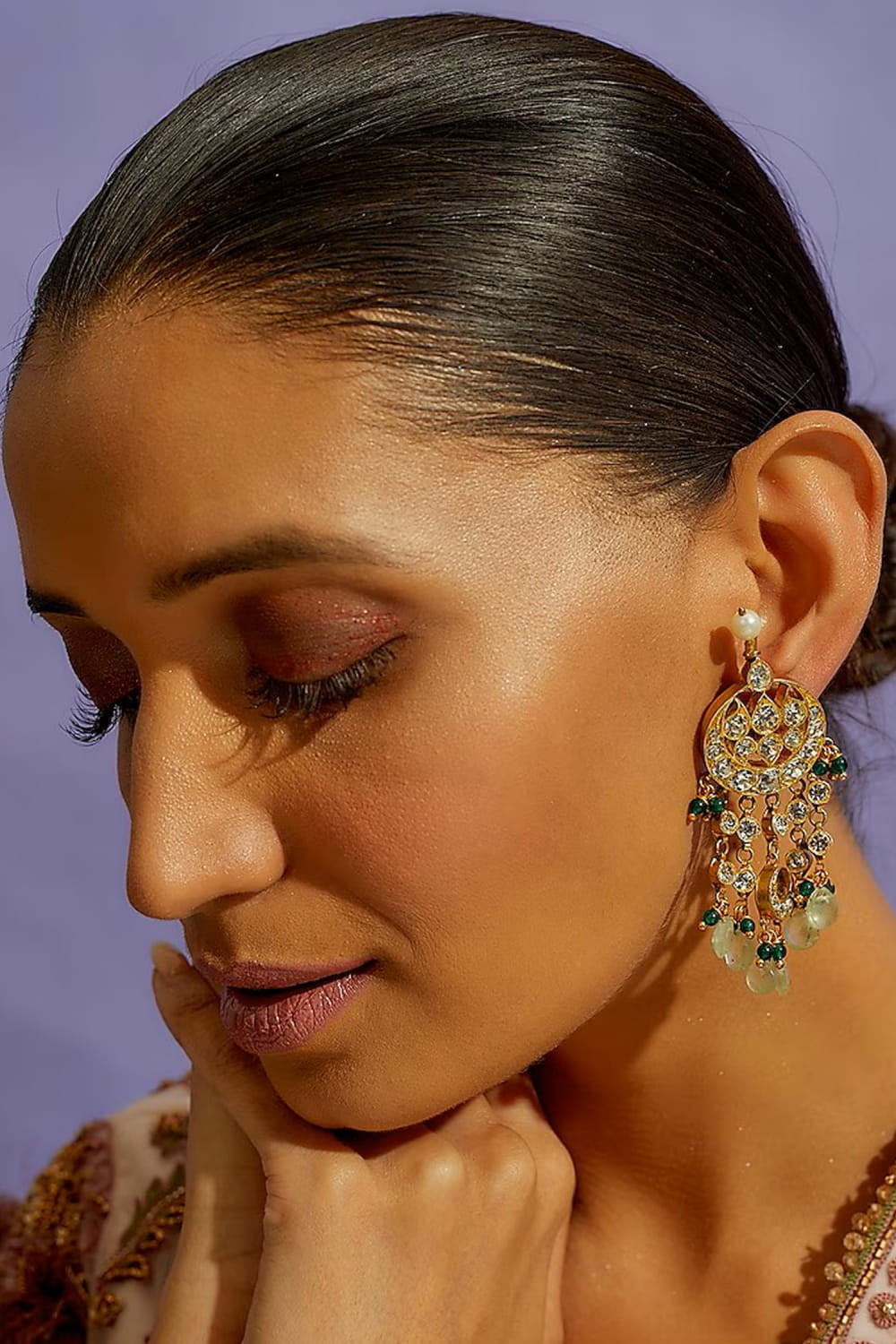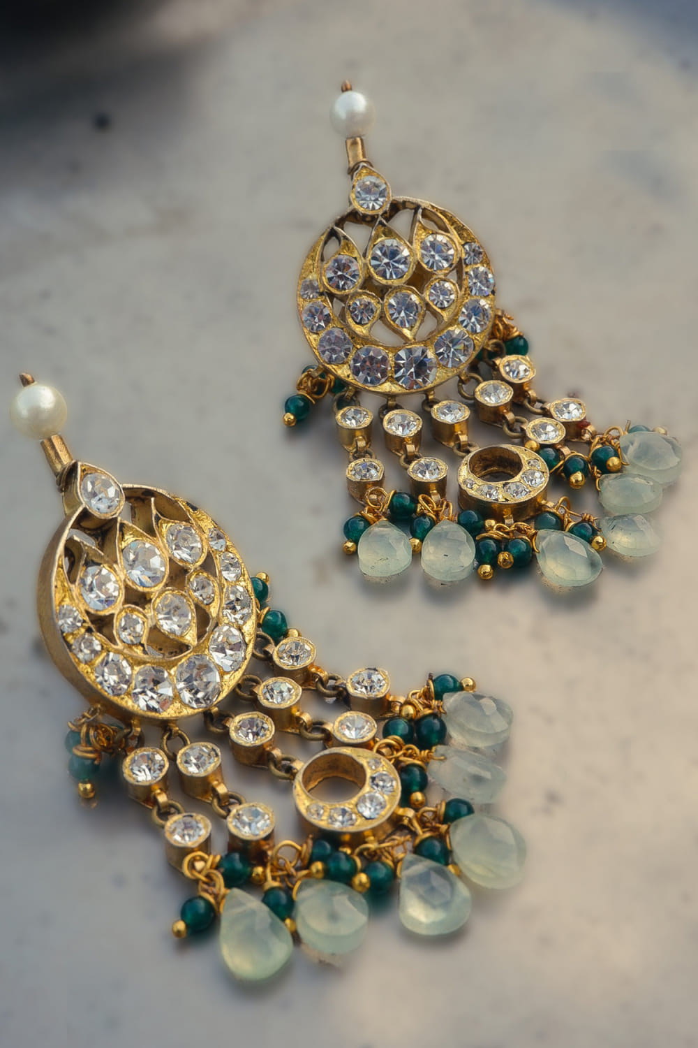 Aaharya designs this stunning pair of danglers rendered in 24kt gold-plated silver with semi-precious stones, pearls, beads and drop detailing. Style them with a peplum and sharara set for wedding glam.