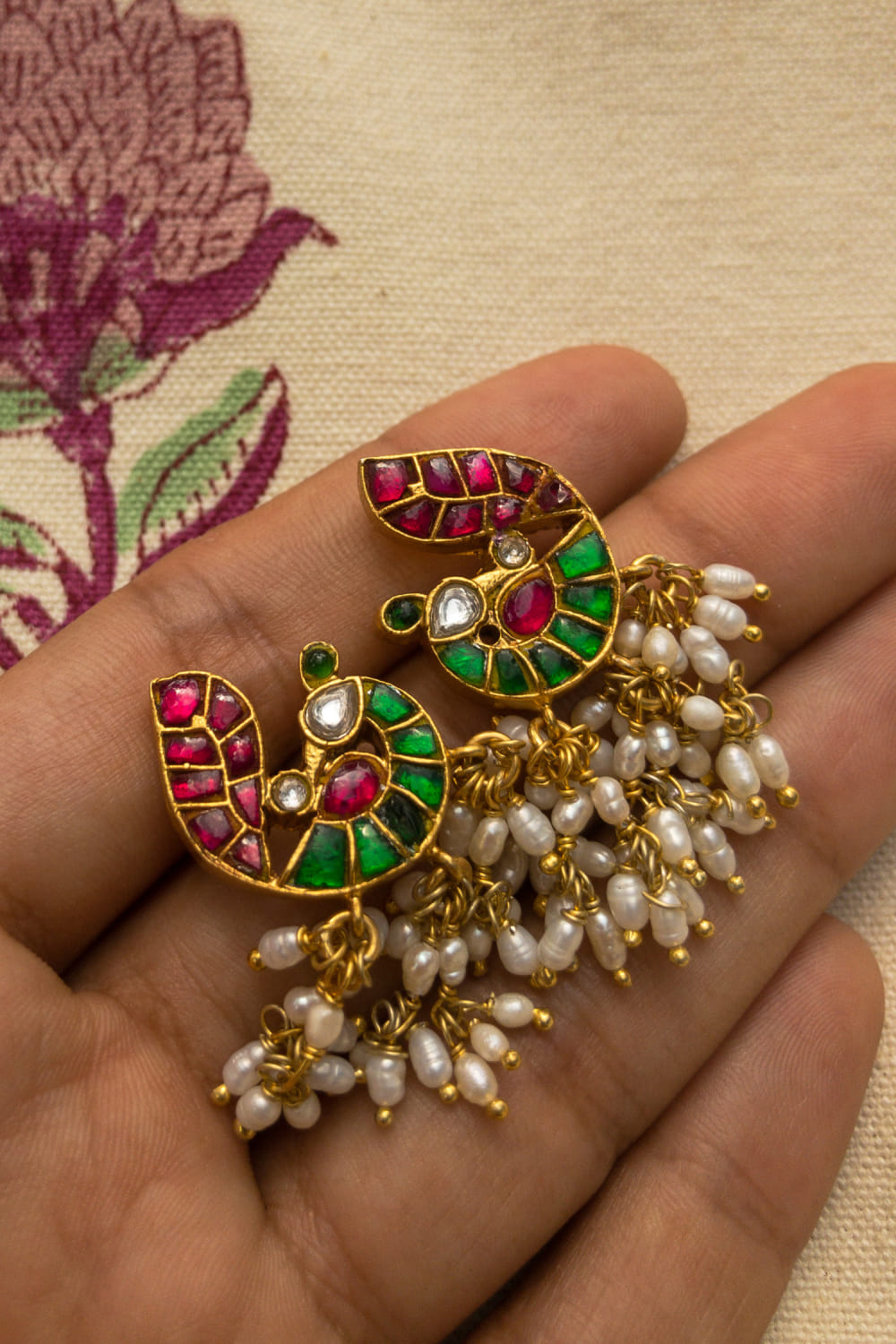 Aaharya designs this dazzling pair of earrings in gold-plated silver encrusted with kemp stones, delicate pearls and semi-precious stone detailing in peacock shapes. Style them with a vibrant sari set for a wedding look.