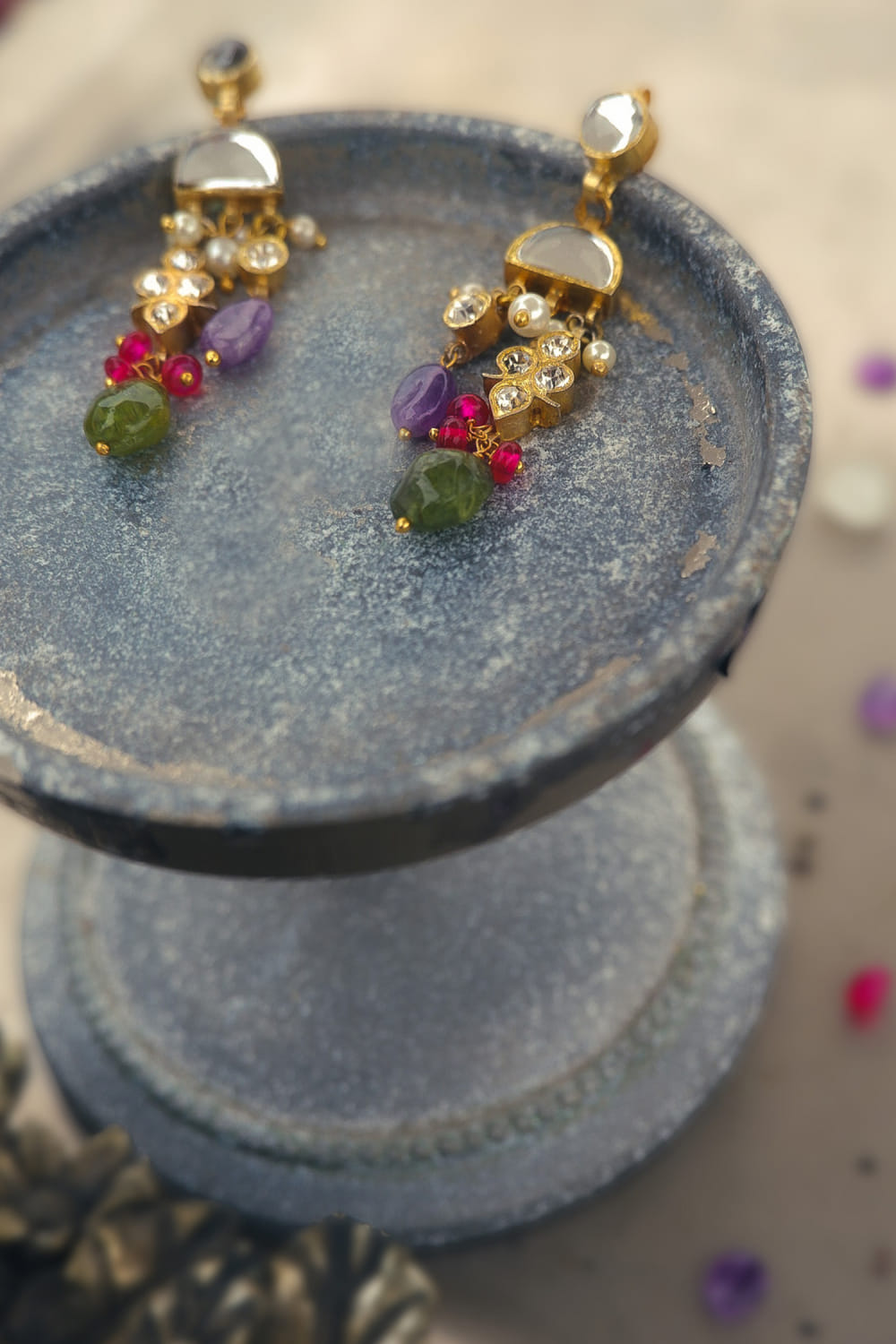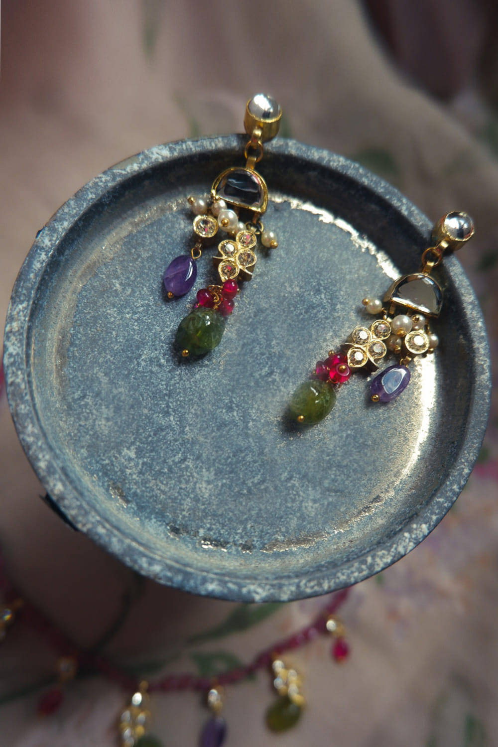 Composition : Gold Plated silver , semi precious stones Care : Spot-Cleaning only. Store in a separate box. Keep away from fragrance and water.