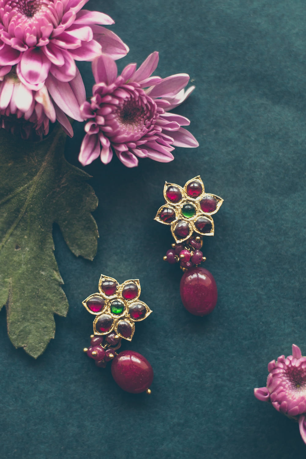 Red and green floral kemp stone embellished drop earrings