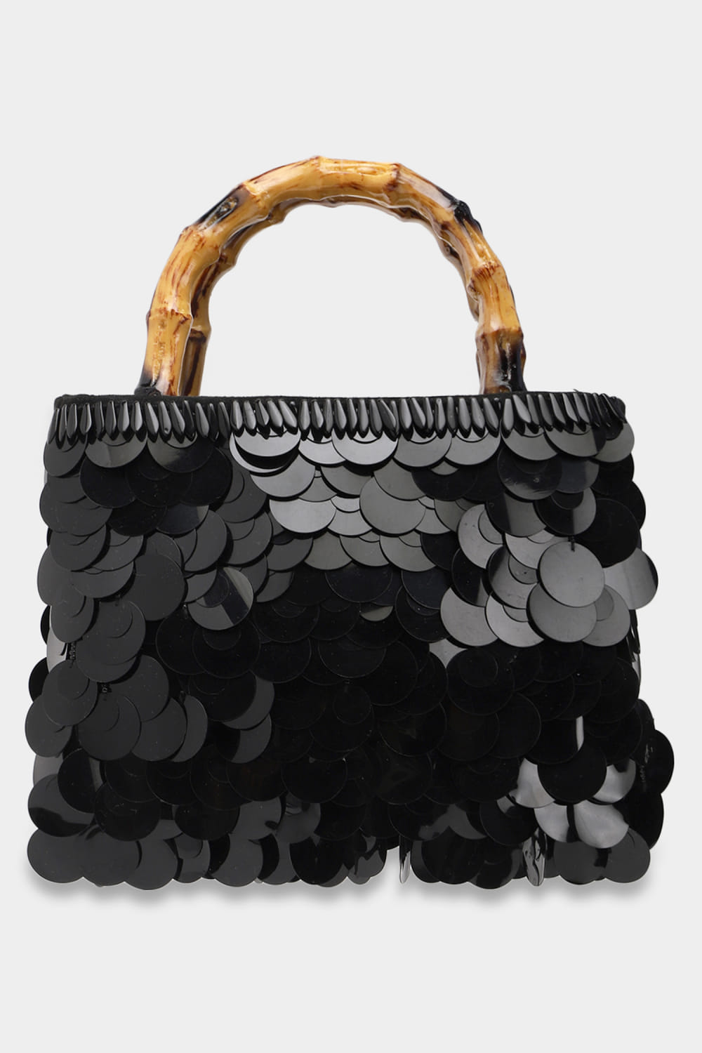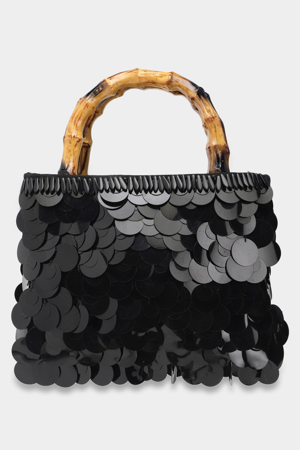 Aanchal Sayal designs this eye-catching handbag in suede enriched with sequin paillette embellishments and stone detailing featuring a wooden handle and drawstrings with crystal detailing. Style it with a jumpsuit for a stylish look.
