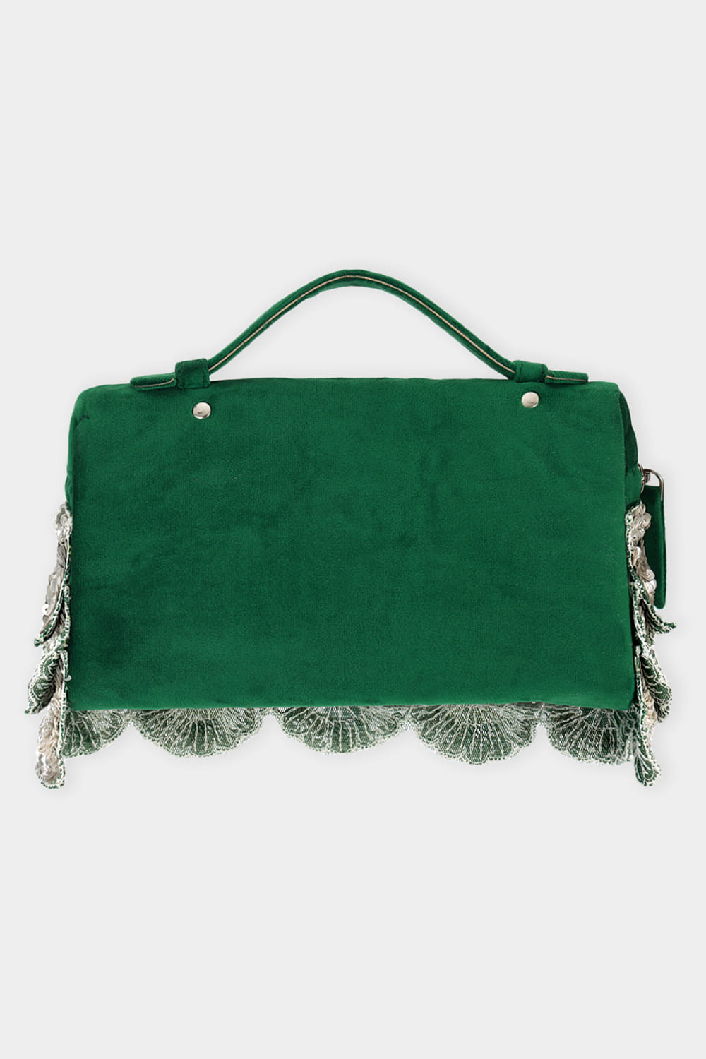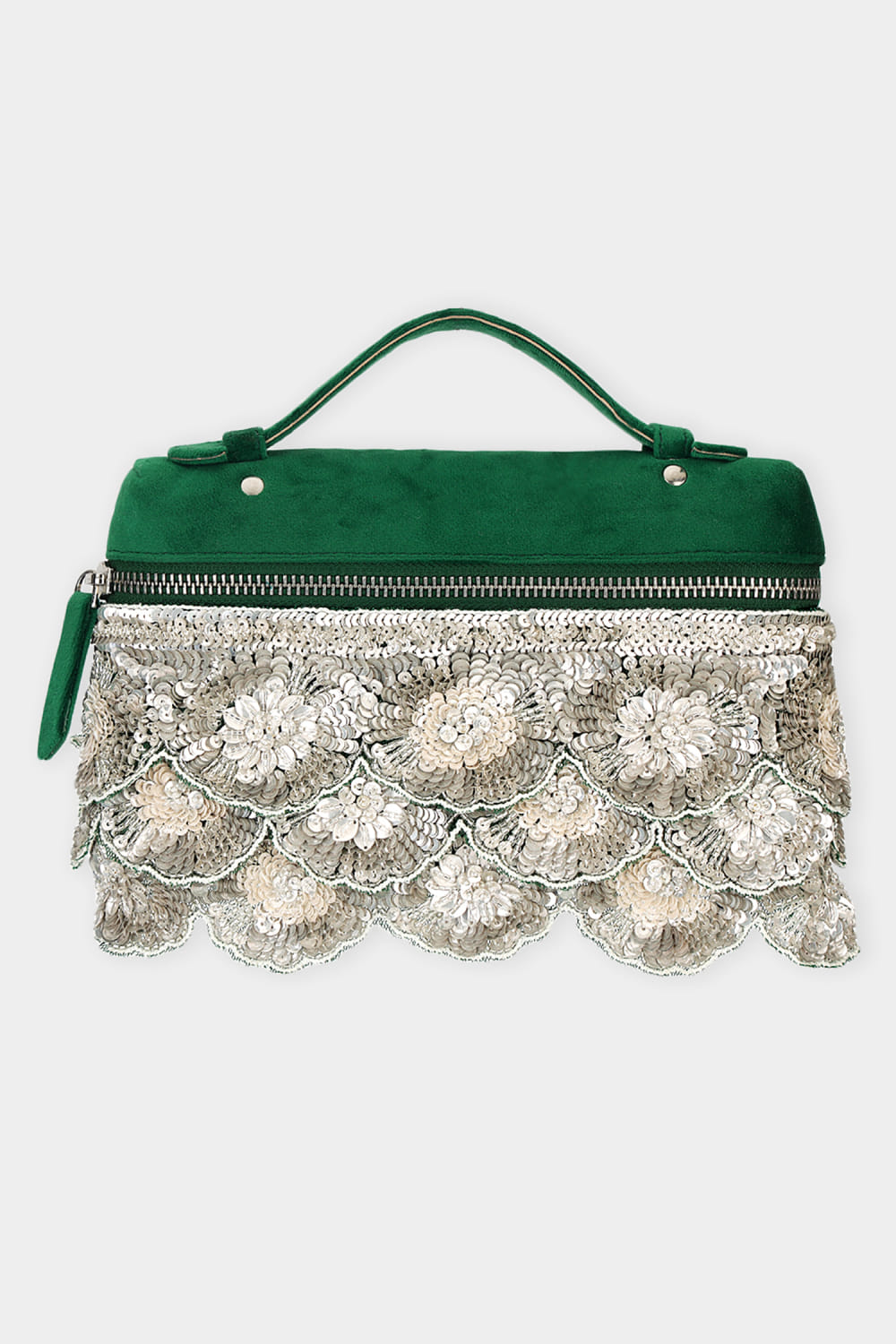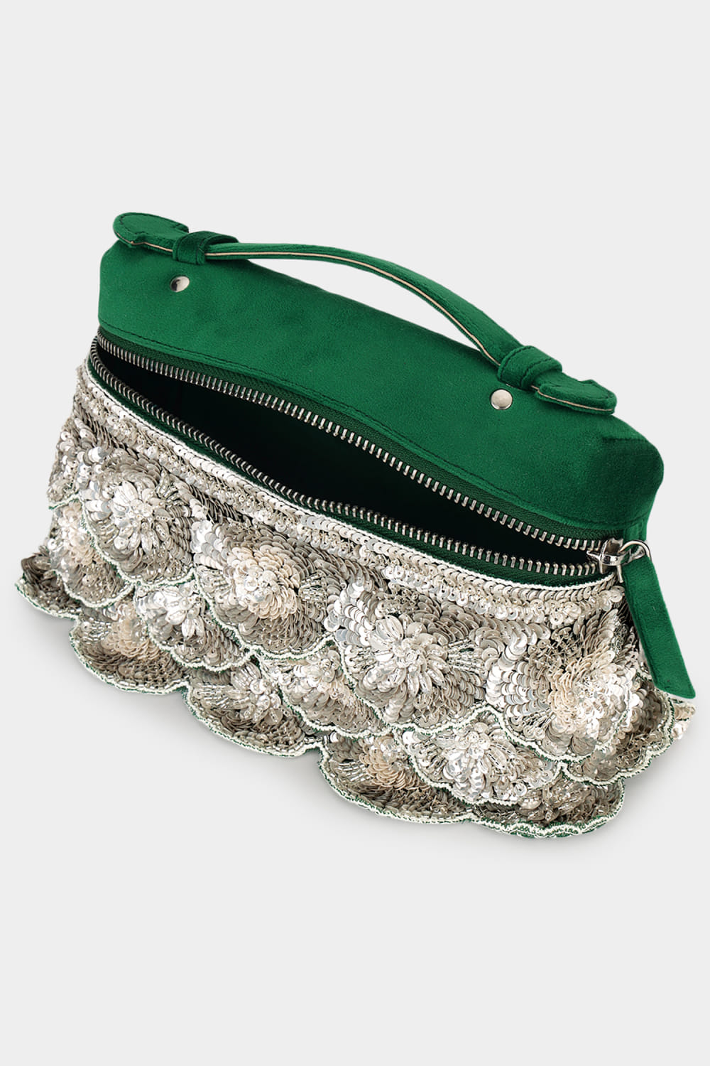 Aanchal Sayal designs this new-age pouch bag customised in soft suede with intricate sequin embroidery in floral pattern. Style it with a casual festive look.