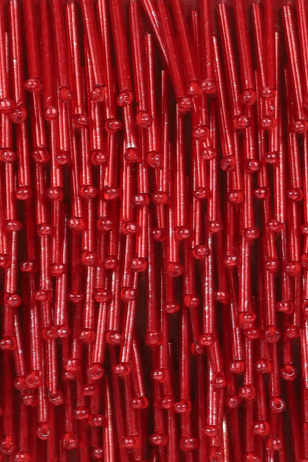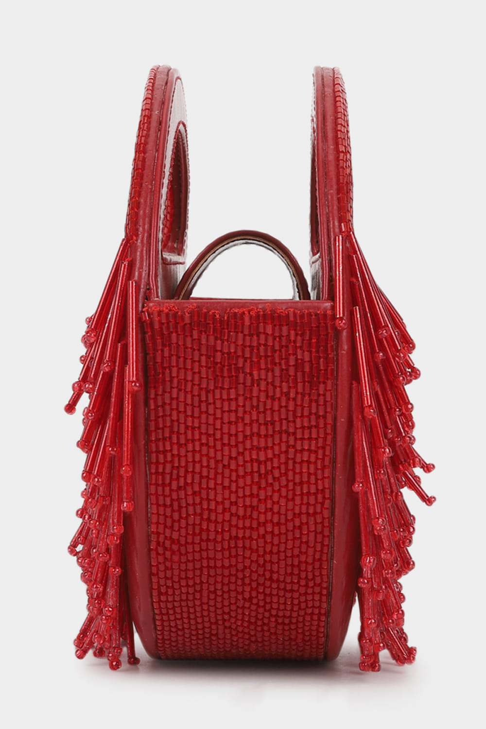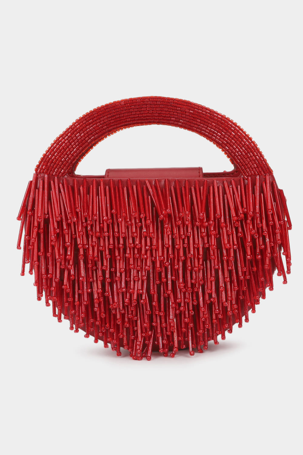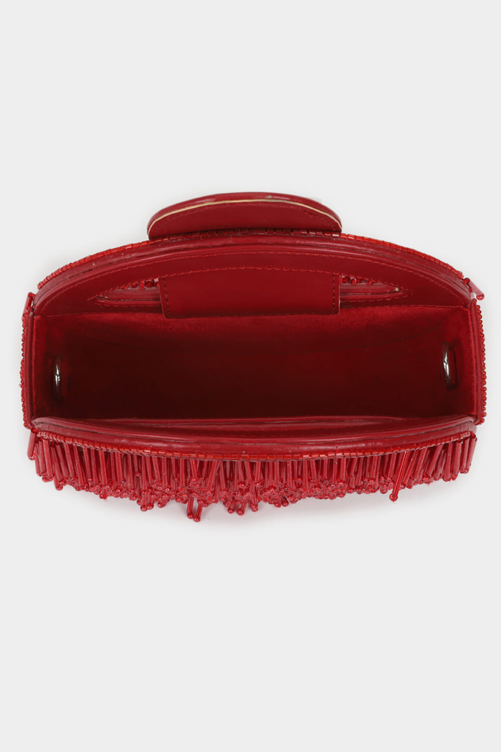 Aanchal Sayal designs this party-ready handbag in faux leather encapsulated with bugle bead embellishments and intricate cutdana embroidery . Style it with a fringed dress to turn heads.