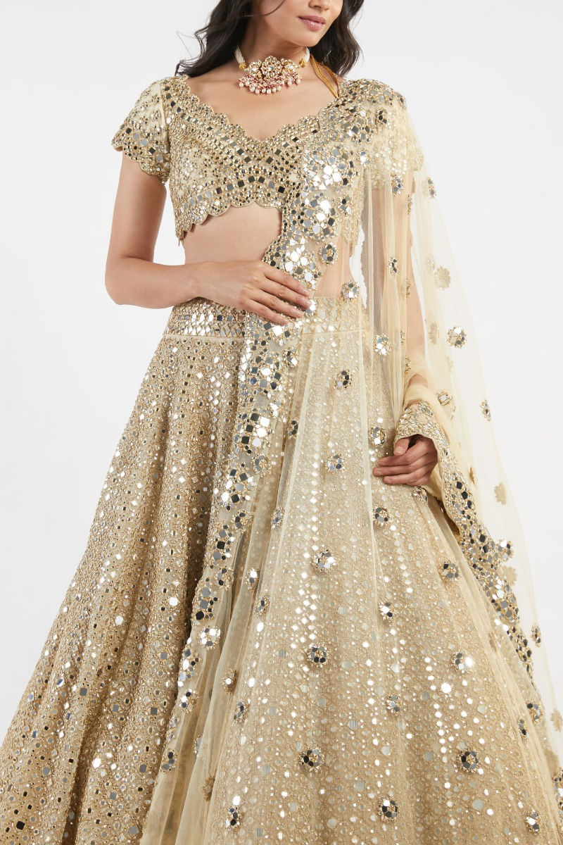 Abhinav Mishra designs this sparkling golden lehenga set in wispy net enriched with zari embroidery and mirror embellishments. Style the look with a pearl necklace set.