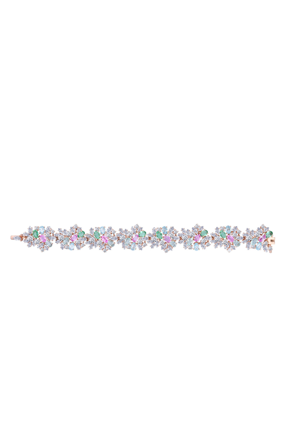 Diosa Paris Jewellery designs this exquisite bracelet customised in rhodium-plated 92.5 sterling silver encapsulated with Swarovski zirconia and handcrafted coloured stone embellishments. Style it with a corset gown to turn heads.
