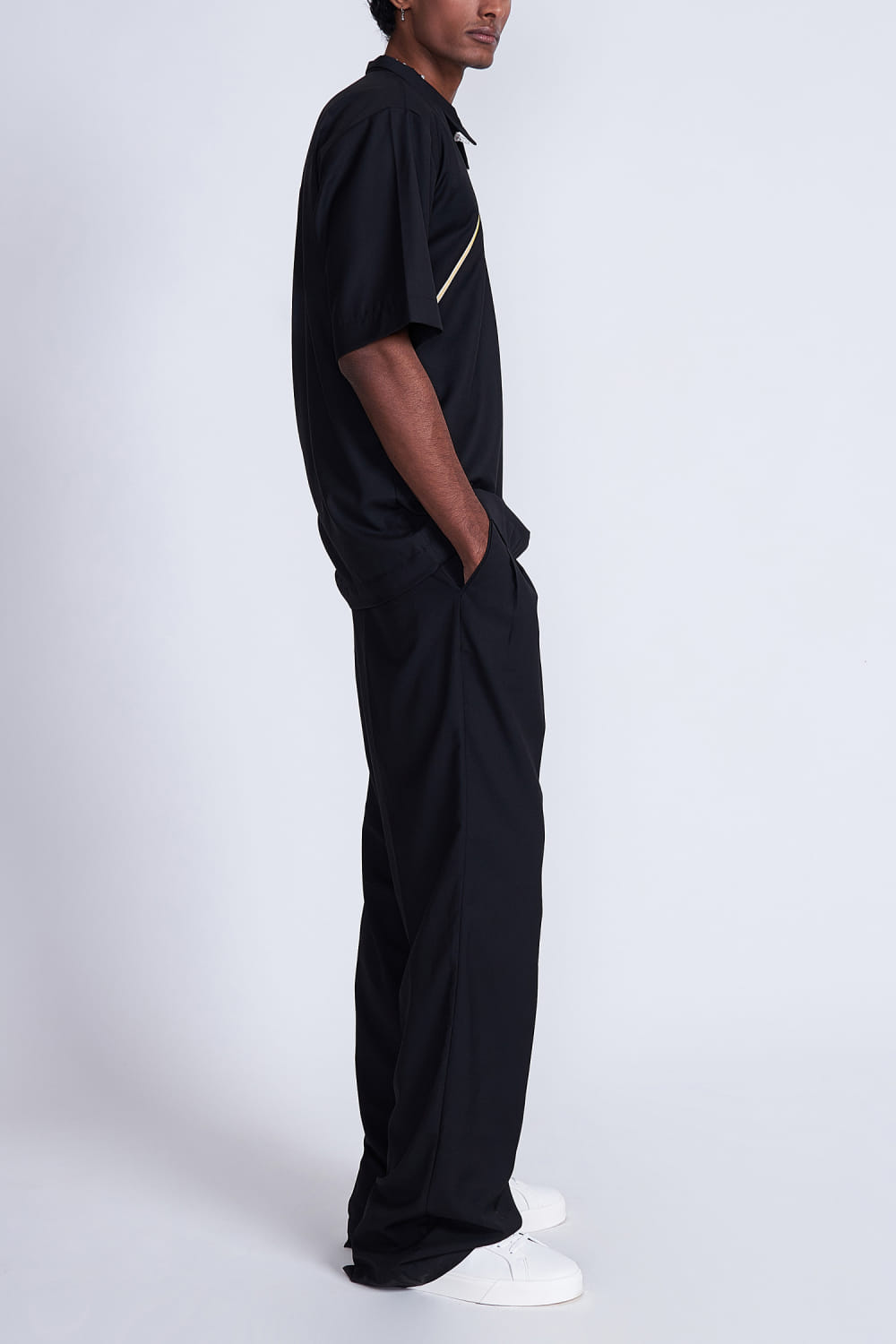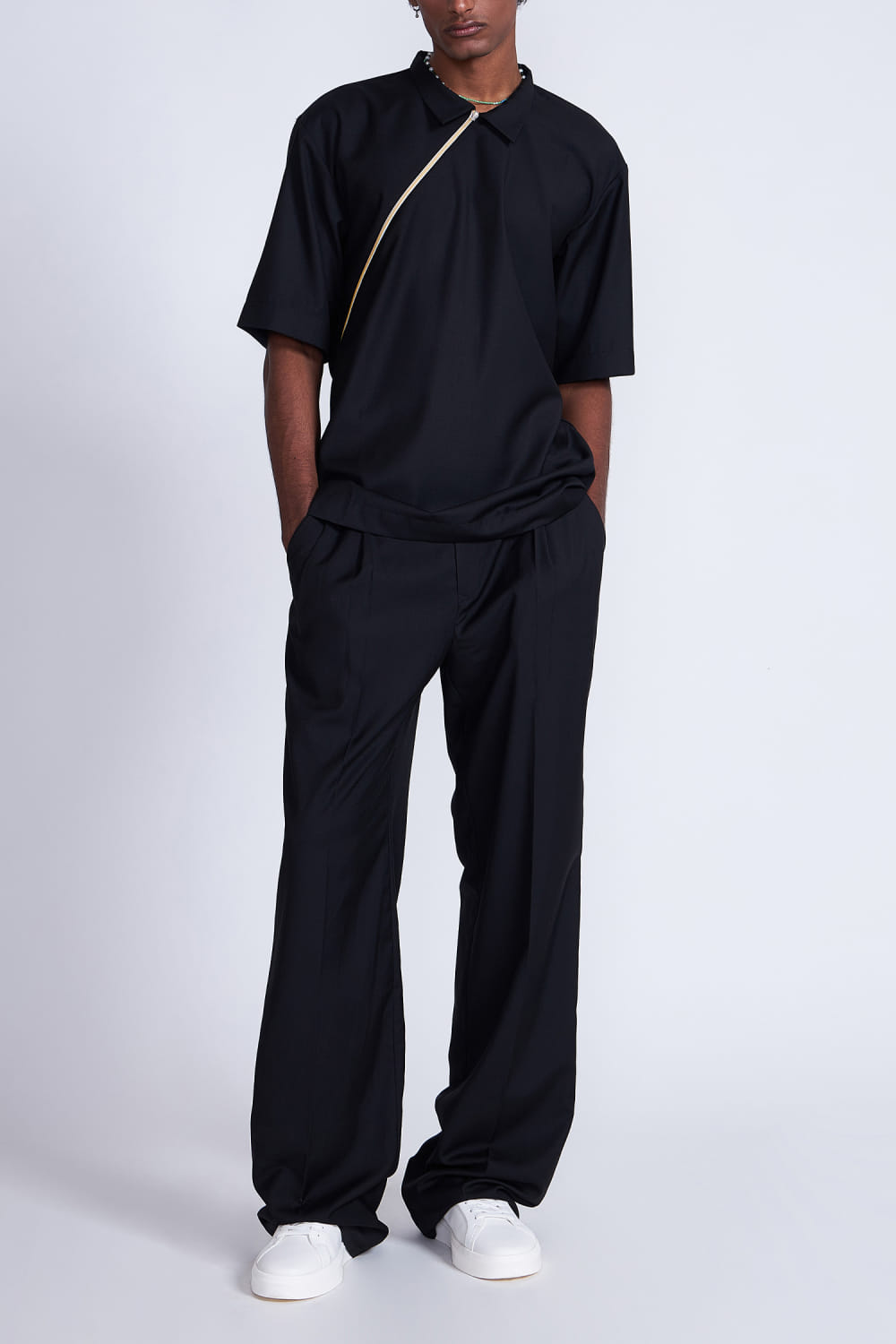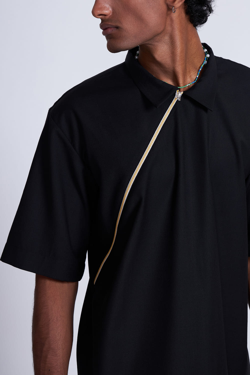 Advait presents this timeless boxy, loose-fit shirt with a distinctive cross zipper detail, adding a touch of edgy sophistication to your wardrobe. Elevate your casual look by pairing it with slim-fit jeans or chinos for a modern aesthetic. Complete the ensemble with classic sneakers or boots for a versatile and stylish statement. The pants here are shown for styling purposes only.