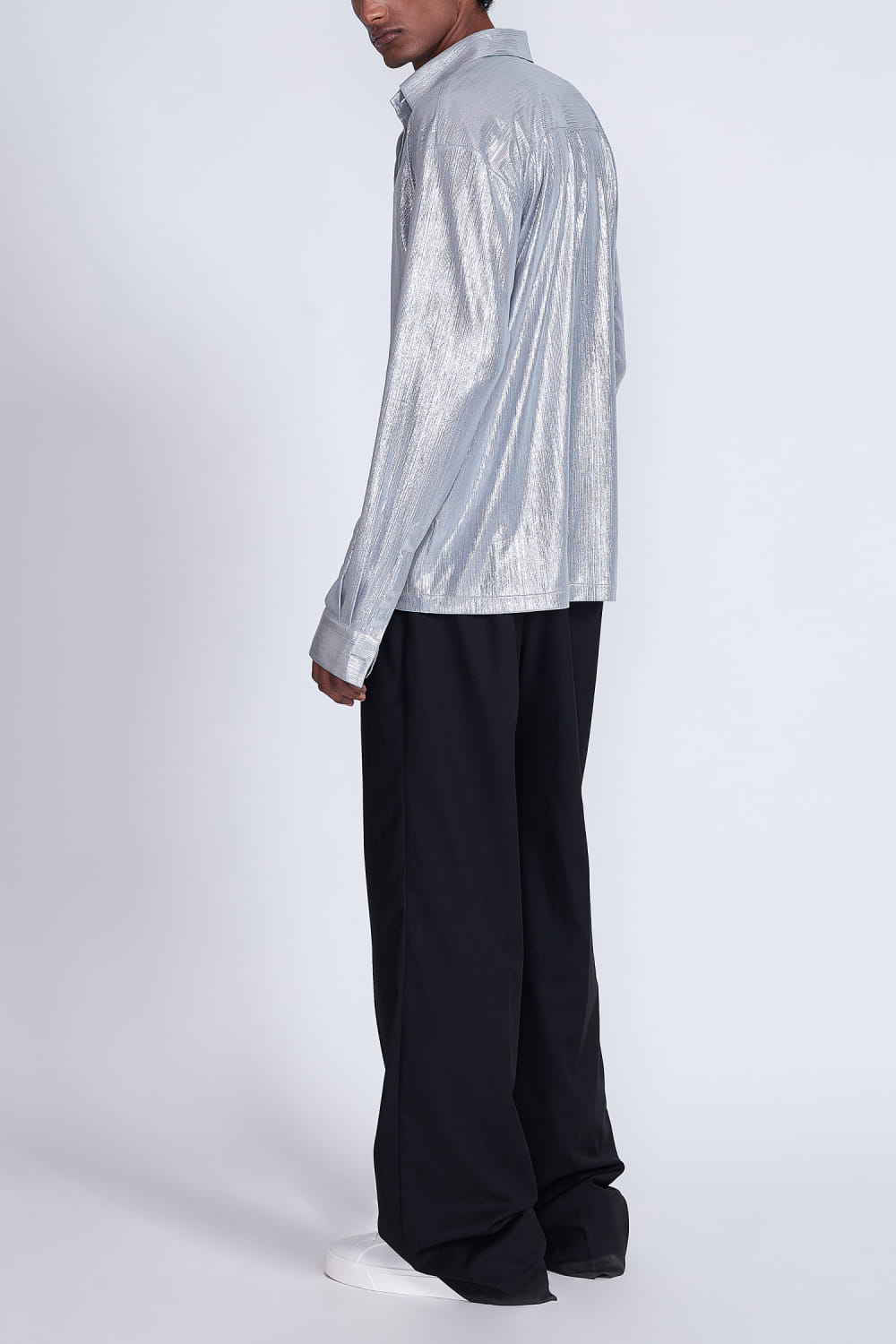 Advait presents this coruscating loose-fitted silver shirt with full sleeves and foil-printed knit detailing, adding a touch of sophistication to your wardrobe. Elevate your evening look by pairing it with tailored black trousers or dark denim for a sleek and modern aesthetic. The pants here are shown for styling purposes only.