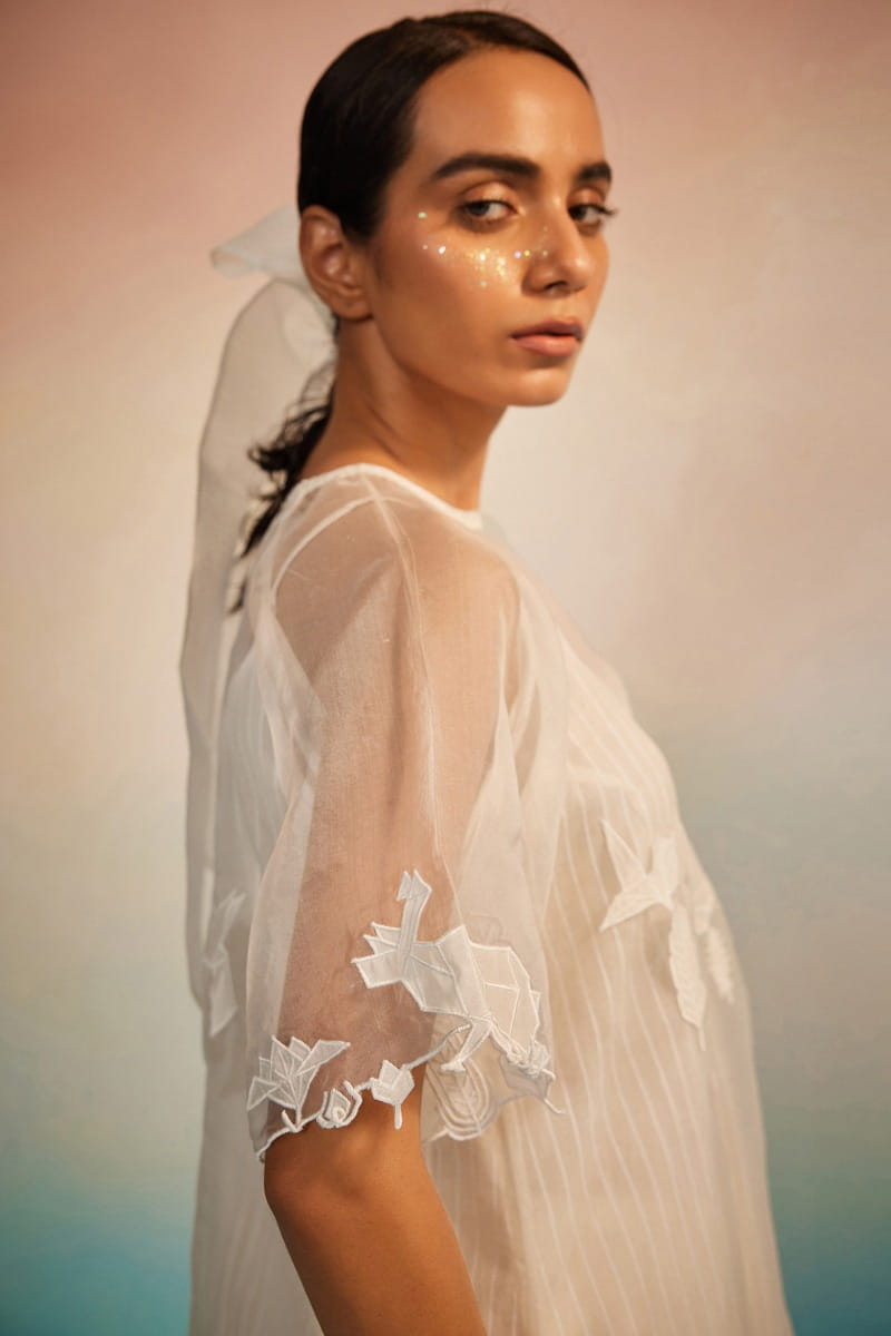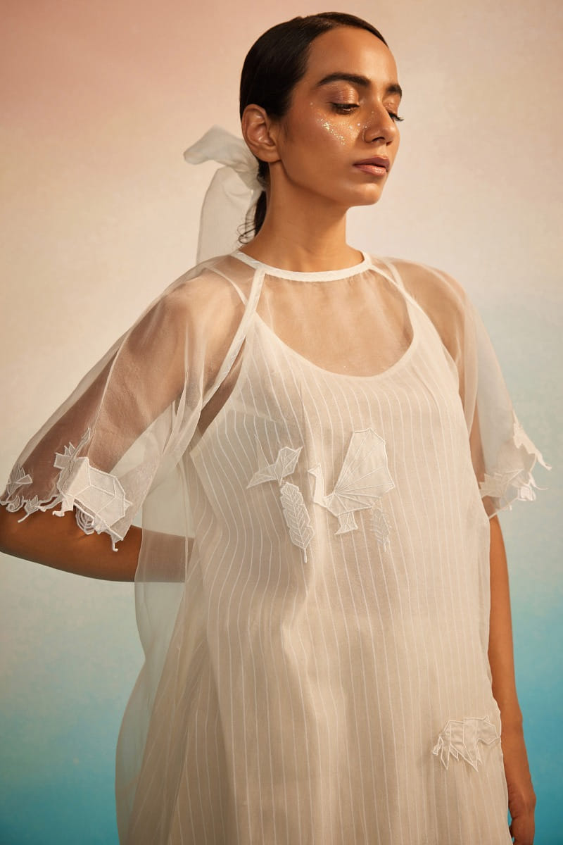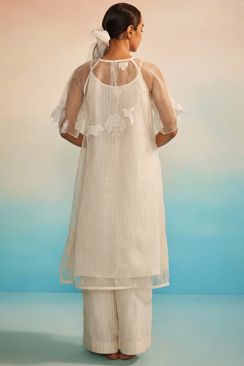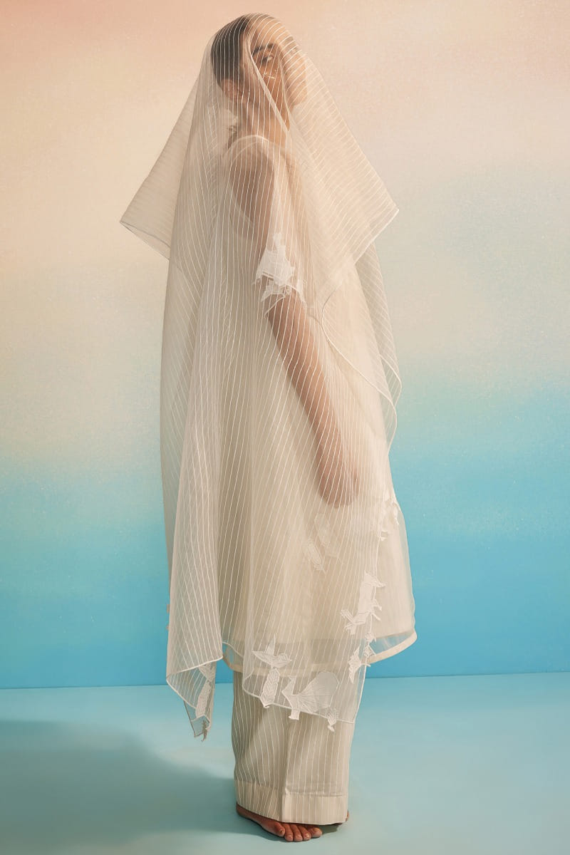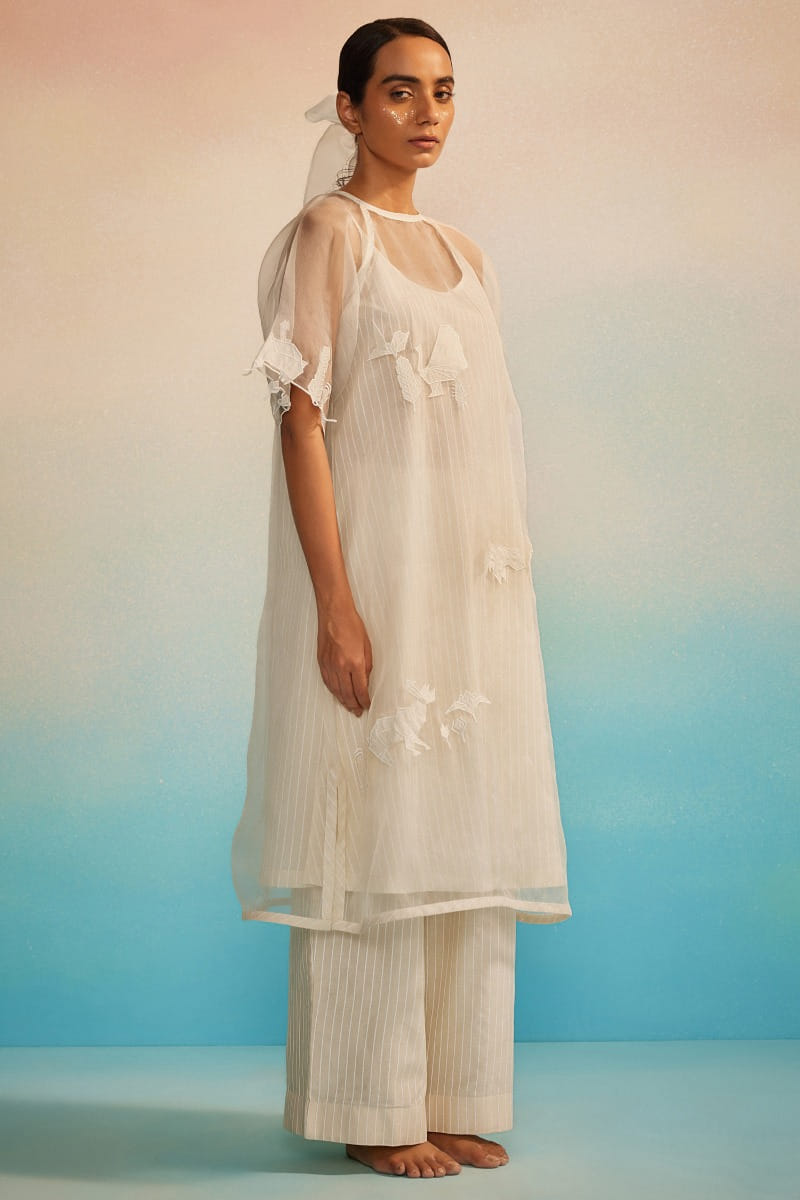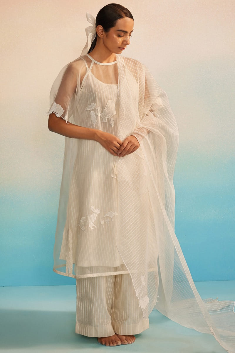 Ahmev designs this modern-minimal sheer kurta crafted in organza, adorned with applique embroidery and raglan sleeves. Teamed with a hand screen-printed striped chanderi and cotton silk slip, striped pants and an appliquéd dupatta, style the set with juttis for a contemporary look rooted in delicacy and quiet craftsmanship.