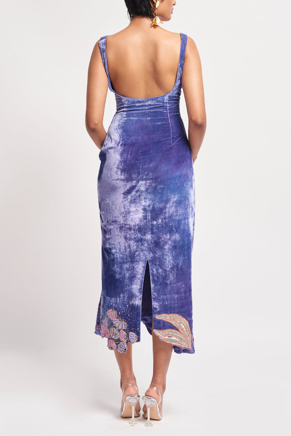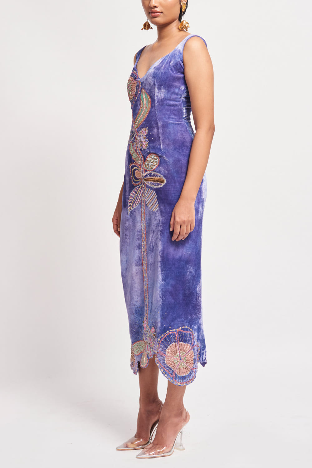 Aisha Rao designs this modern sleeveless dress in velvet enriched with applique embroidery and delicate embellishments in floral and leaf placement patterns featuring cutwork hem. Style the look with a clutch and block heels.