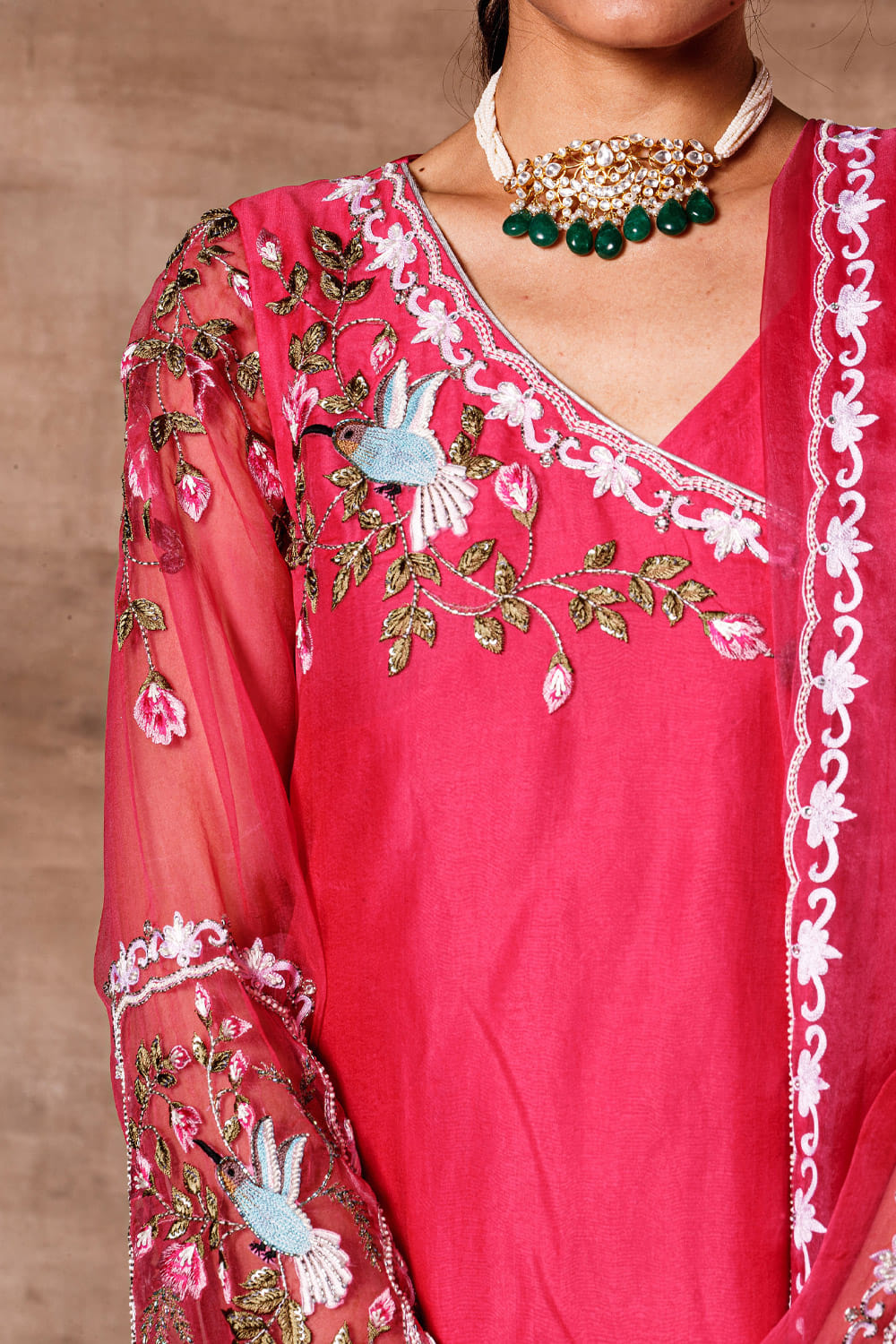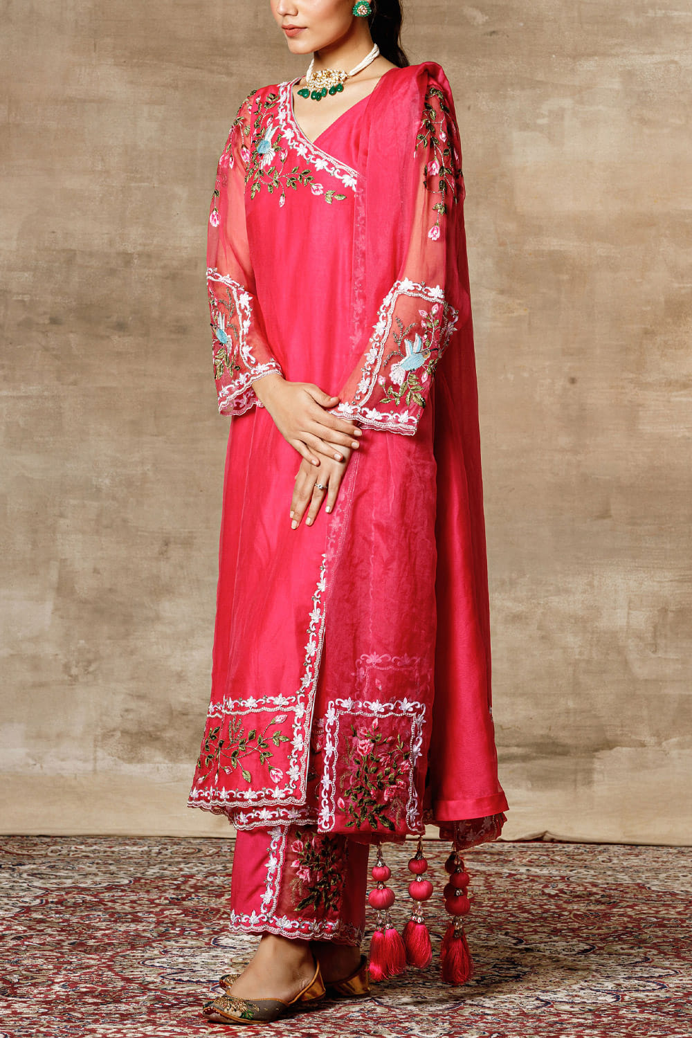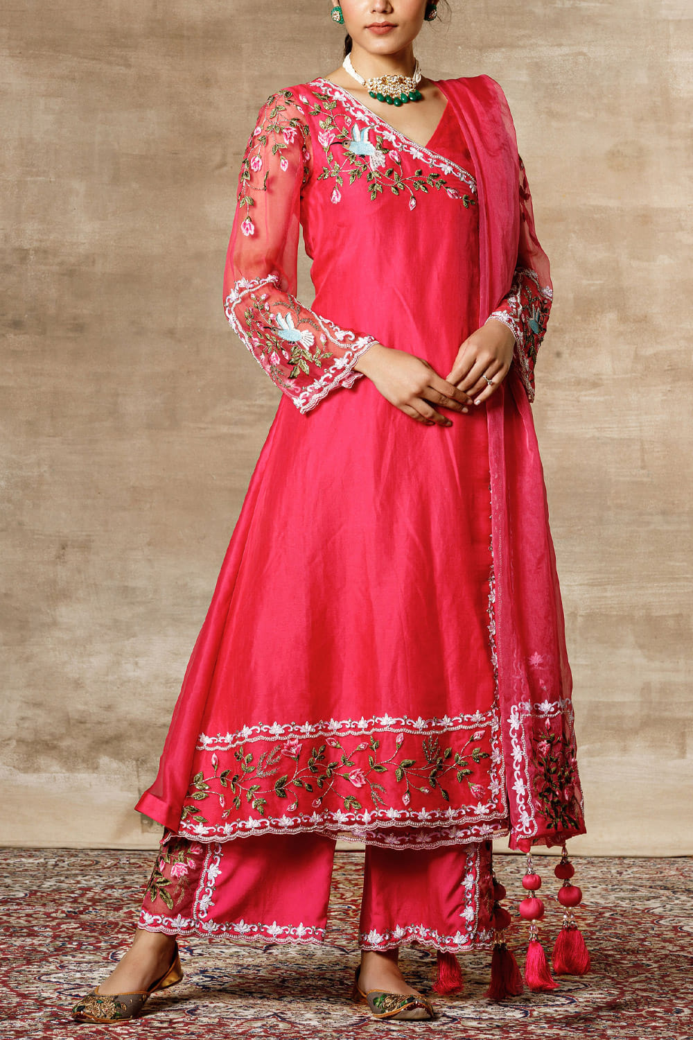 Ajiesh Oberoi designs a regal festive look with this angrakha style organza kurta and palazzo set featuring intricately embroidered motifs, complemented with an embellished dupatta. Style the look with a kundan choker necklace.