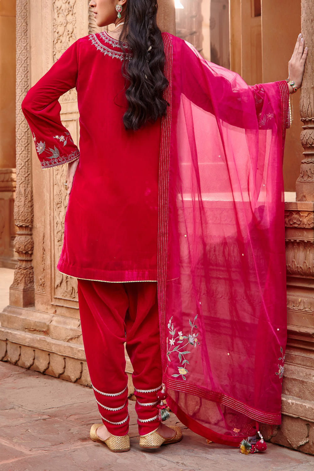 Ajiesh Oberoi designs this traditional short kurta in silk velvet encapsulated with intricate dori embroidery detailing and bead embellishments in floral patterns, pairing it with matching dhoti pants and a matching dupatta. Style the look with kolhapuri wedges and a potli bag.