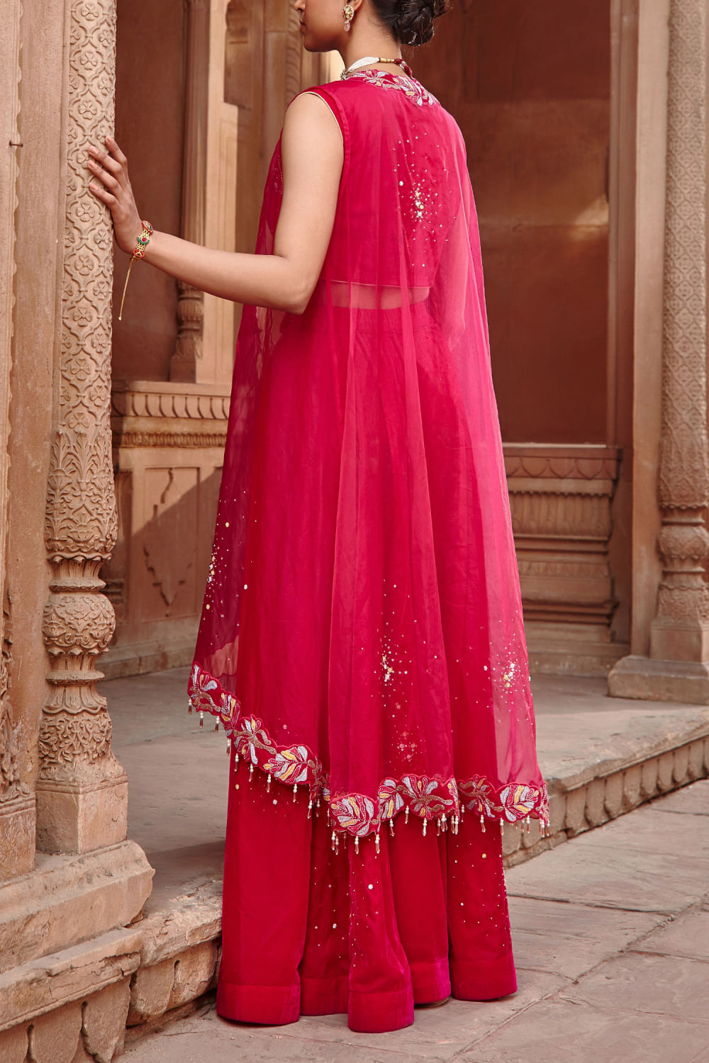 Ajiesh Oberoi designs this stunning sleeveless jacket embraced in silk velvet with embroidery detailing in leaf patterns featuring scattered hand embroidery with dainty embellishments and beaded tassel accents in an asymmetrical silhouette, teaming it with a matching sharara and a matching blouse. Style the look with an emerald choker and a double-finger ring.