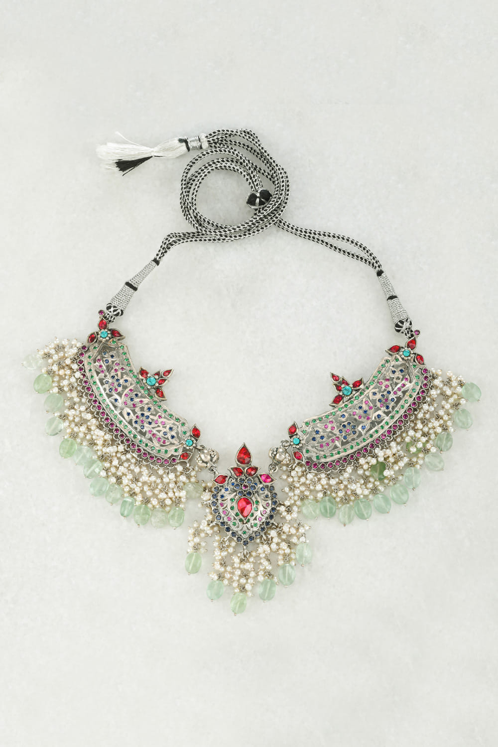 Ajooni Jewels designs this vintage-inspired jadau necklace handcrafted in silver, embellished with multicolour glass stones and pearl drop accents. Style the look with a plunge neck choli and lehenga set.