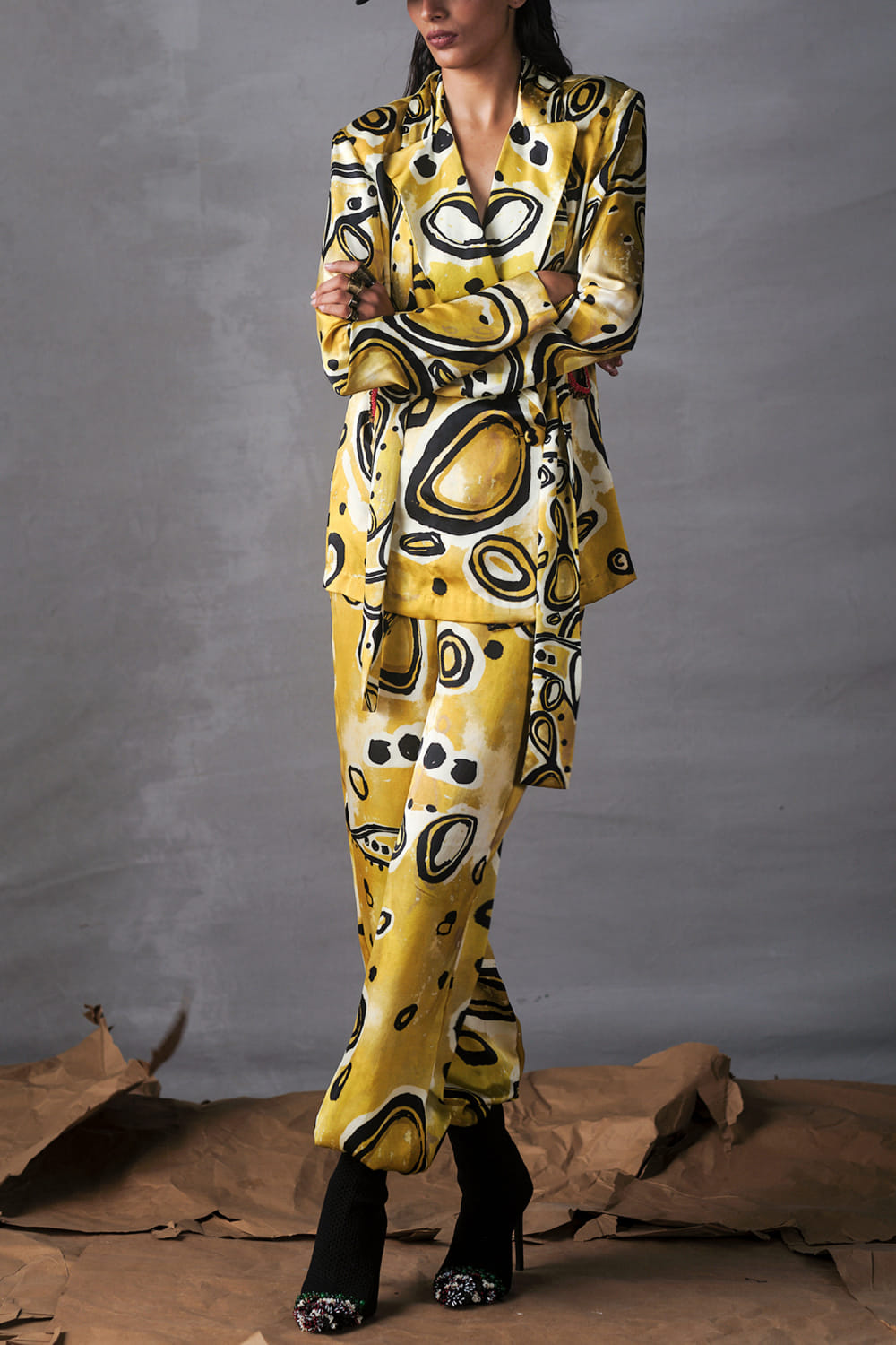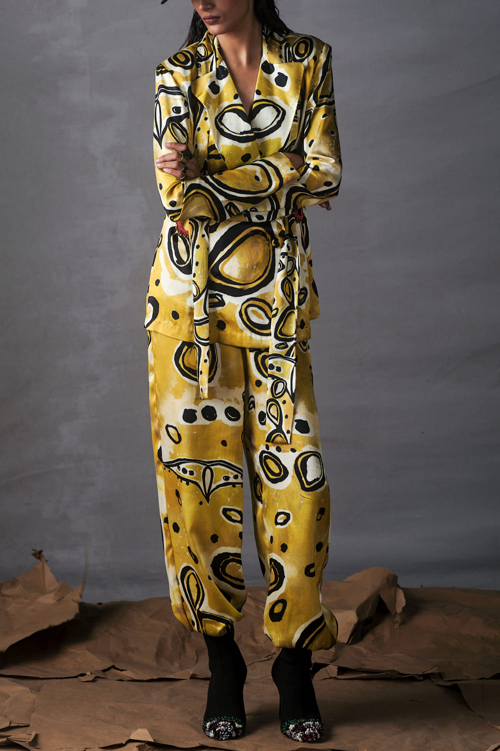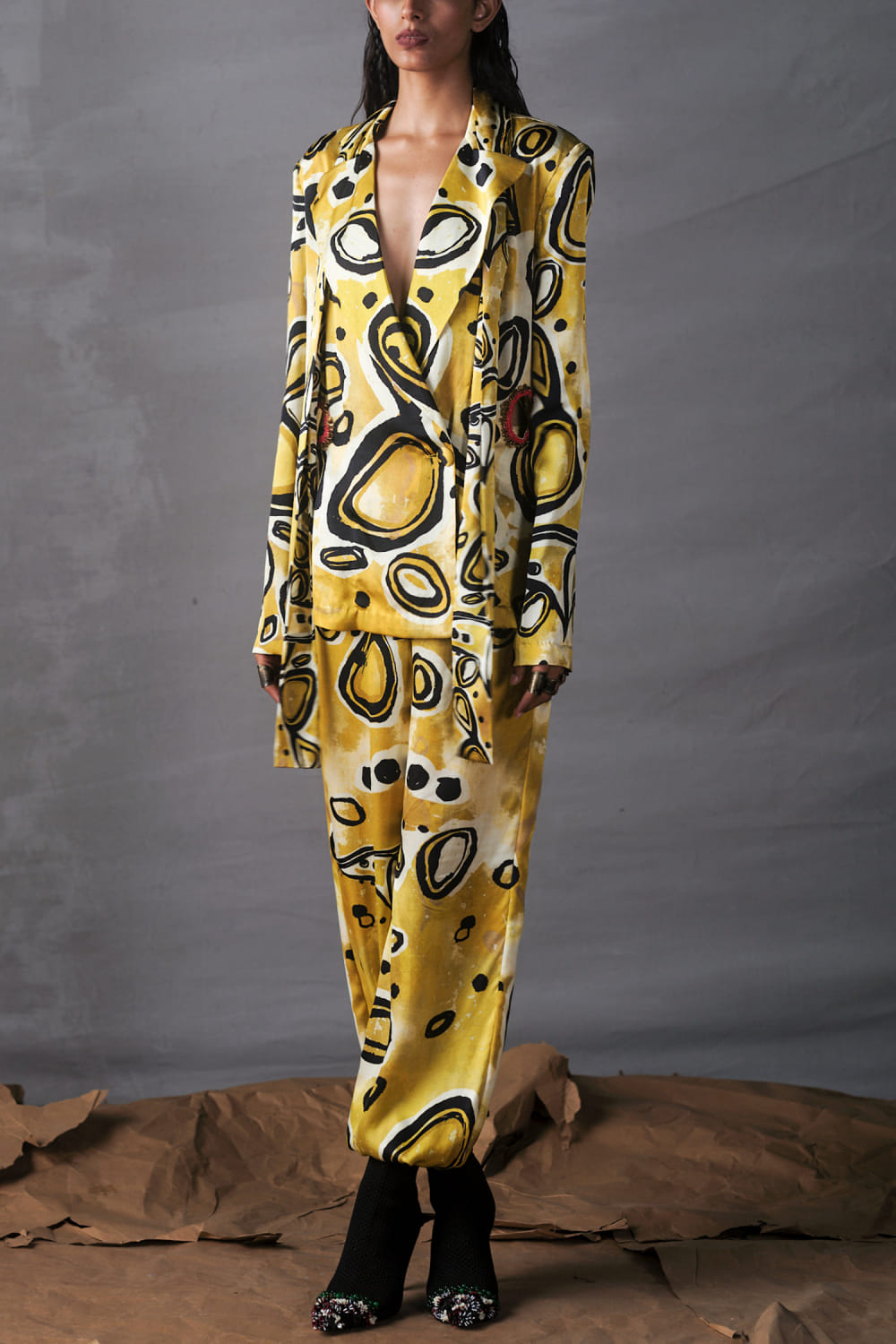 AK-OK designs this modern blazer and joggers crafted in silk featuring an abstract print pattern. Style the look with cuff earrings and a cap for a resort vibe.