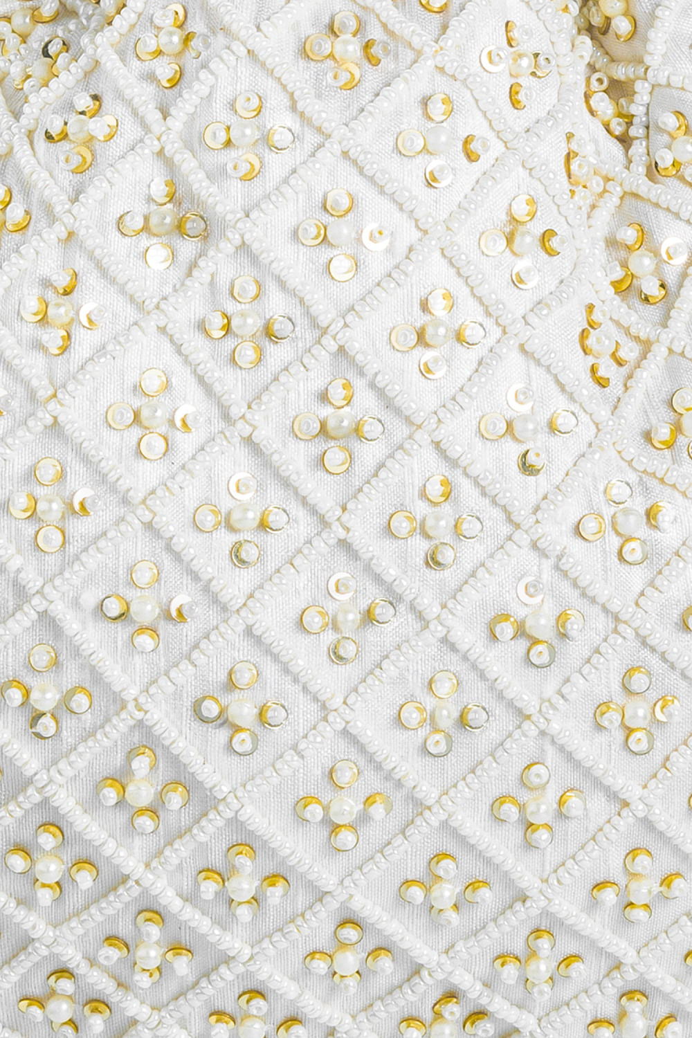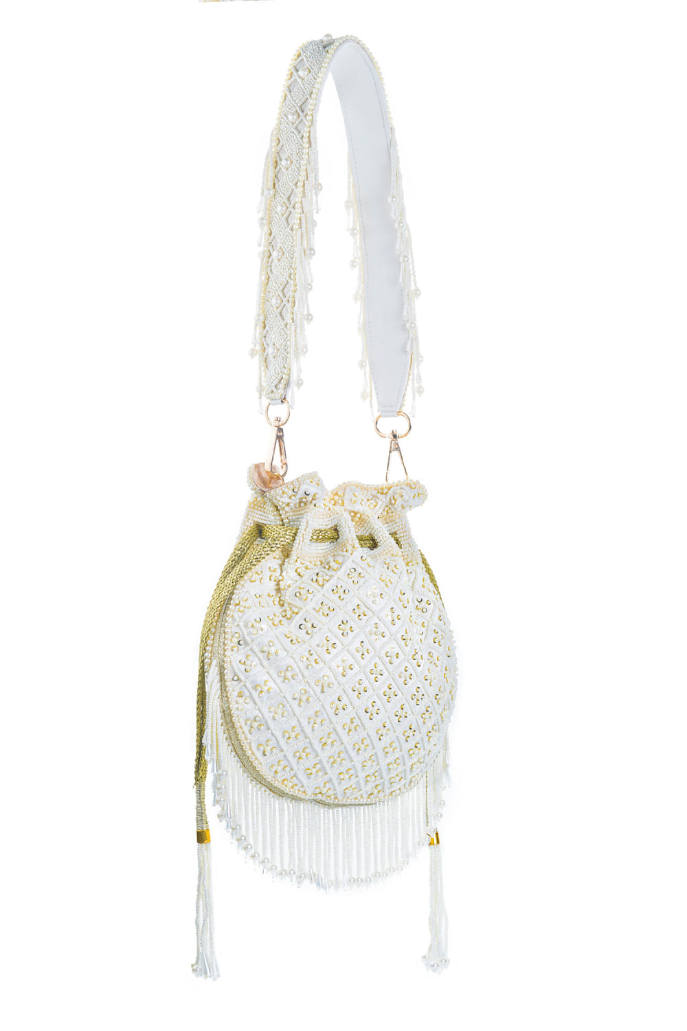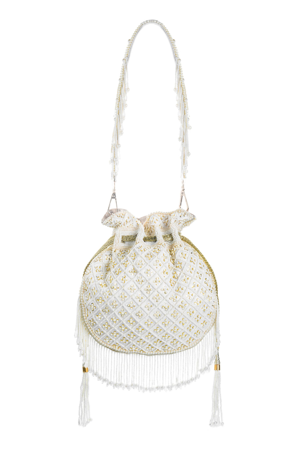 Aloha by Pia and Sonal designs this classic potli bag in silk enriched with pearls, sequin work and bead embellishments in geometrical patterns featuring glass crystal and pearl tassel detailing and a hand-embroidered handle. Style it with a sharara set for a festive look.