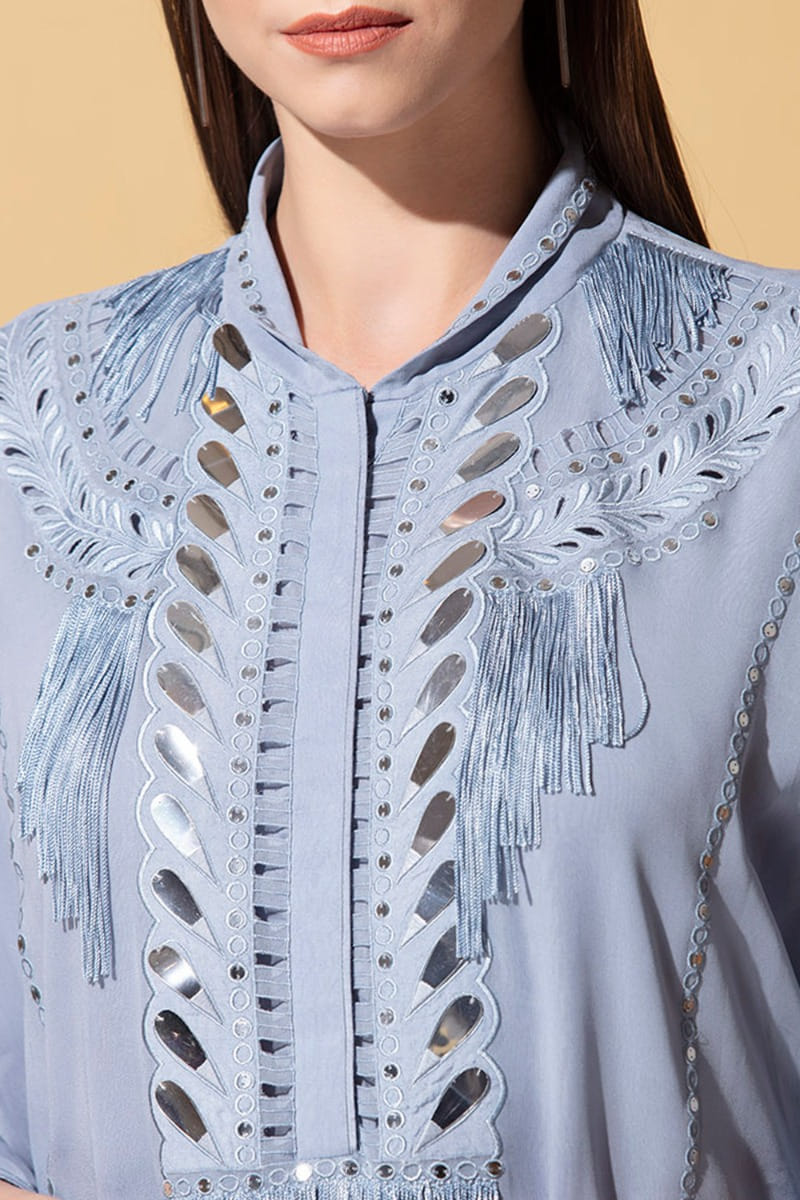AMPM designs an effortlessly elegant look with this georgette tunic embellished with lustrous handcrafted motifs, delicate fringes, polished sequins and teamed with pants. Accessorize the look with a bucket bag.