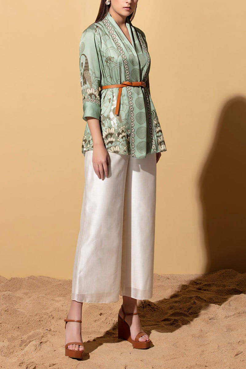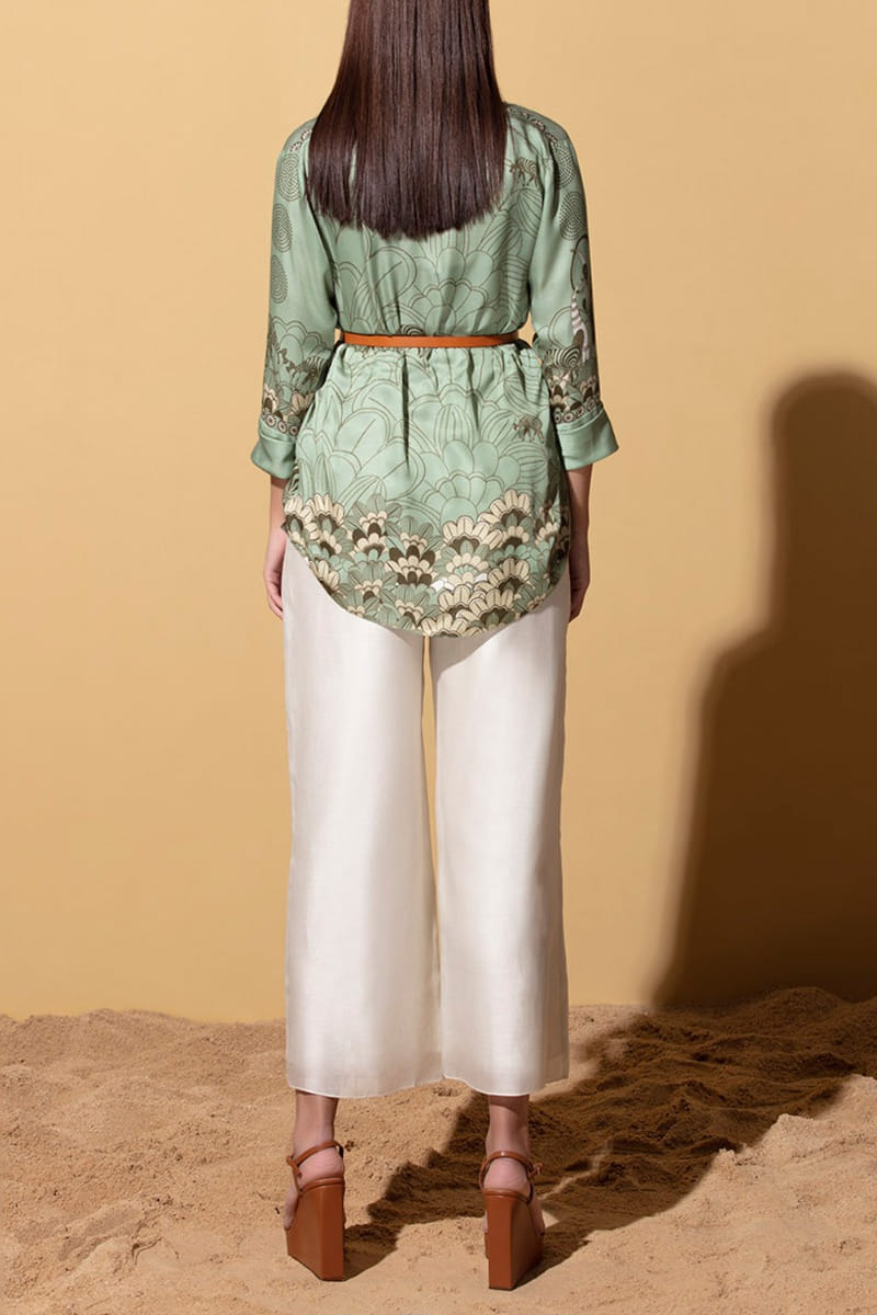 Sage green satin printed top and belt