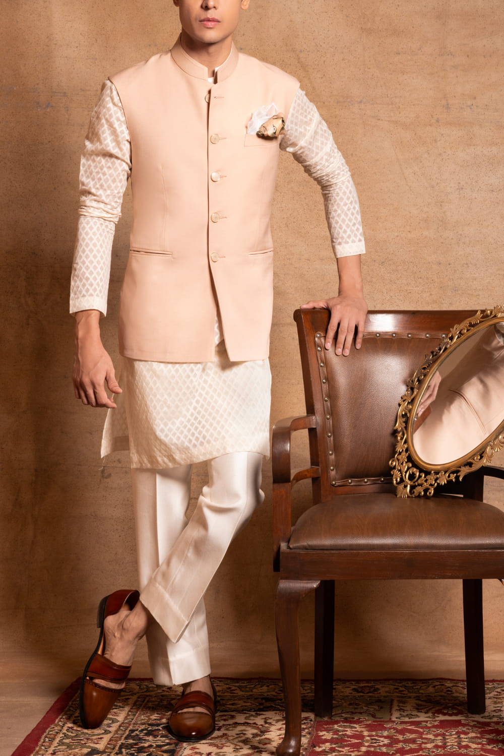 Amrit Dawani designs this culturally rich bandi crafted in Italian poly wool, paired with a self-textured chanderi kurta and cotton silk pants. Style the look with a brooch for an ethnic look.