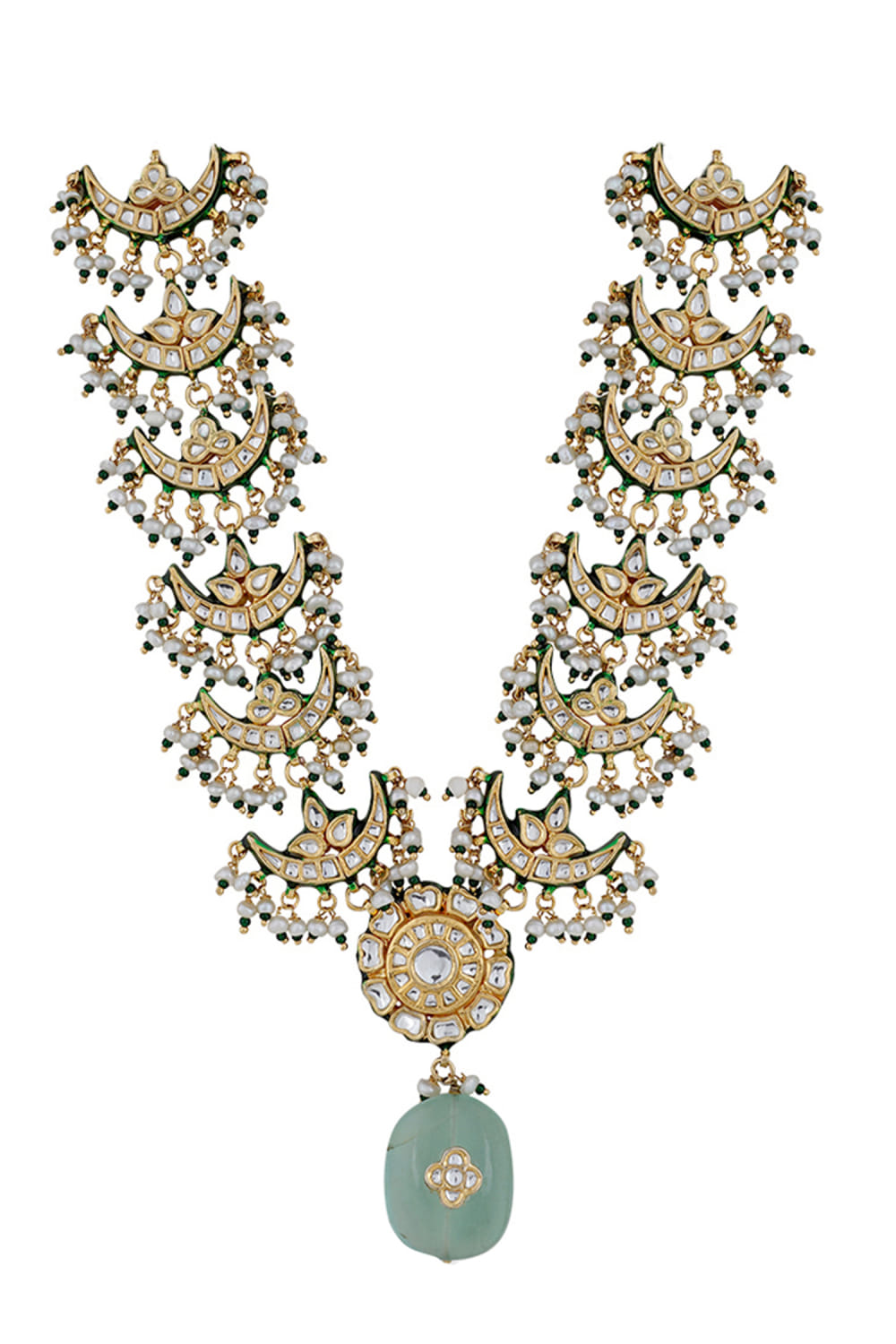 Anayah Jewellery designs this regal-inspired necklace with kundan embellishments and stone drops. Style it with a traditional bridal lehenga set.