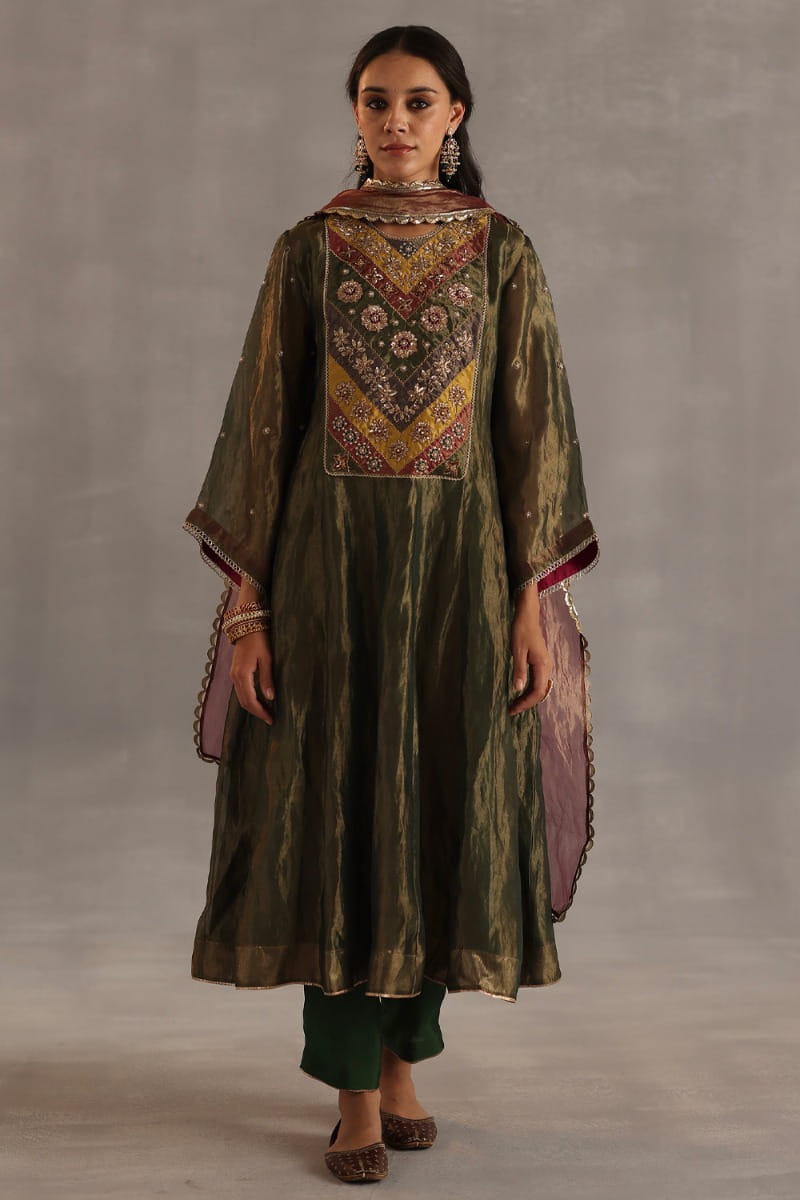 Ankit V Kapoor designs a contemporary festive look with this short button down kurta teamed with off-white pants. Style the look with a Nehru jacket and traditional juttis.