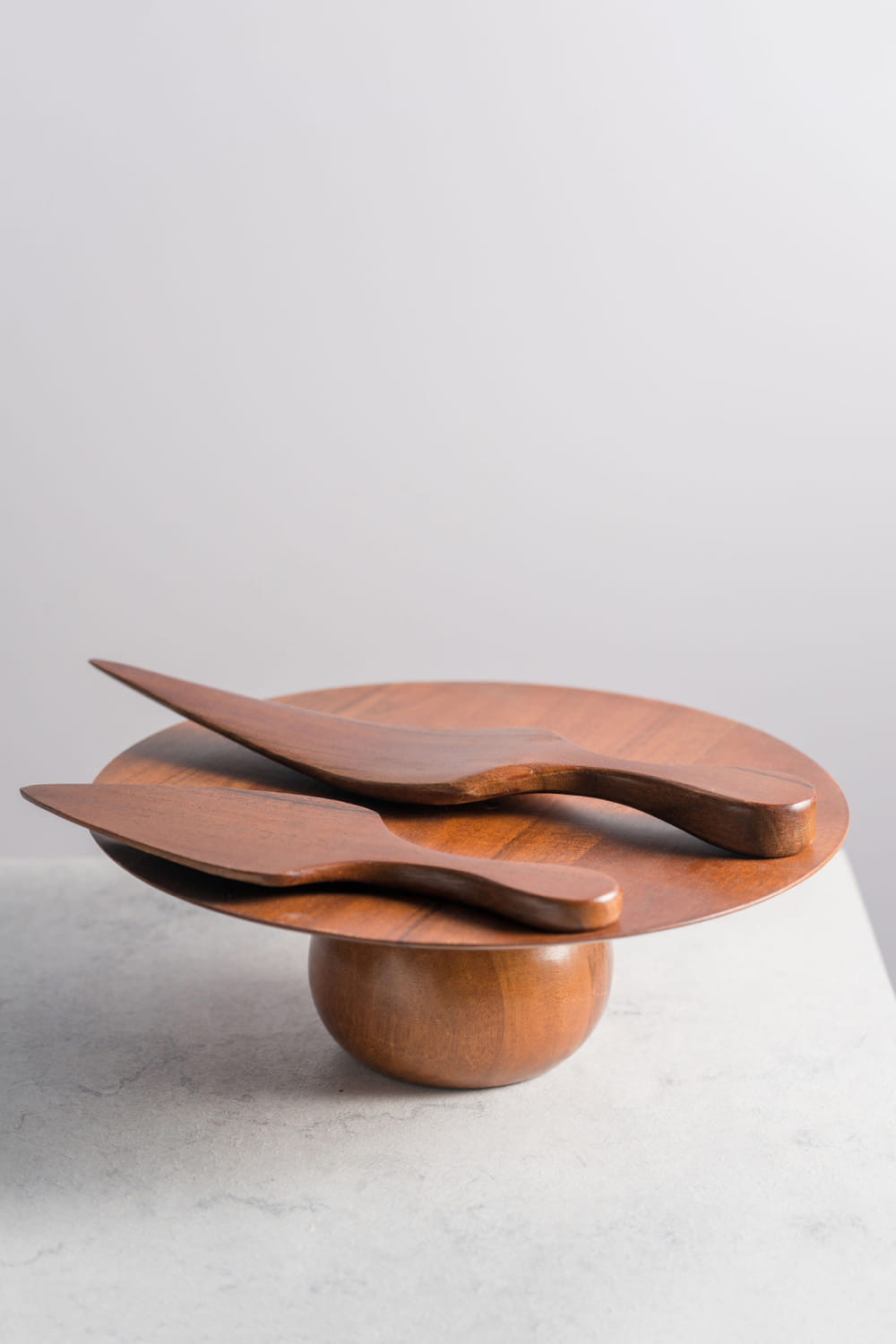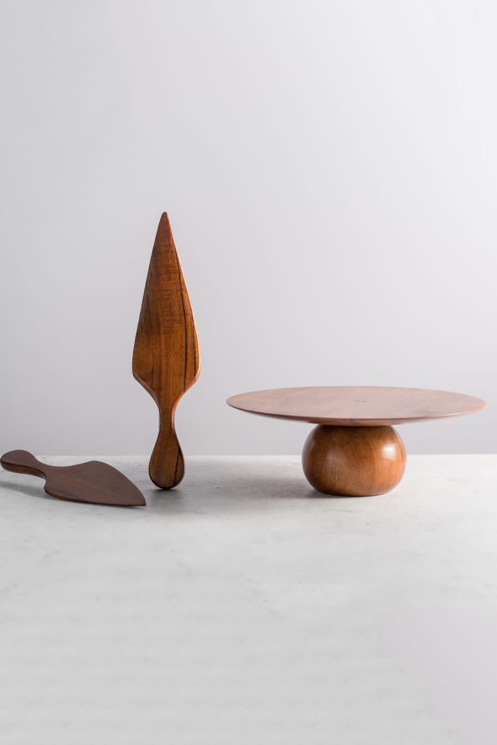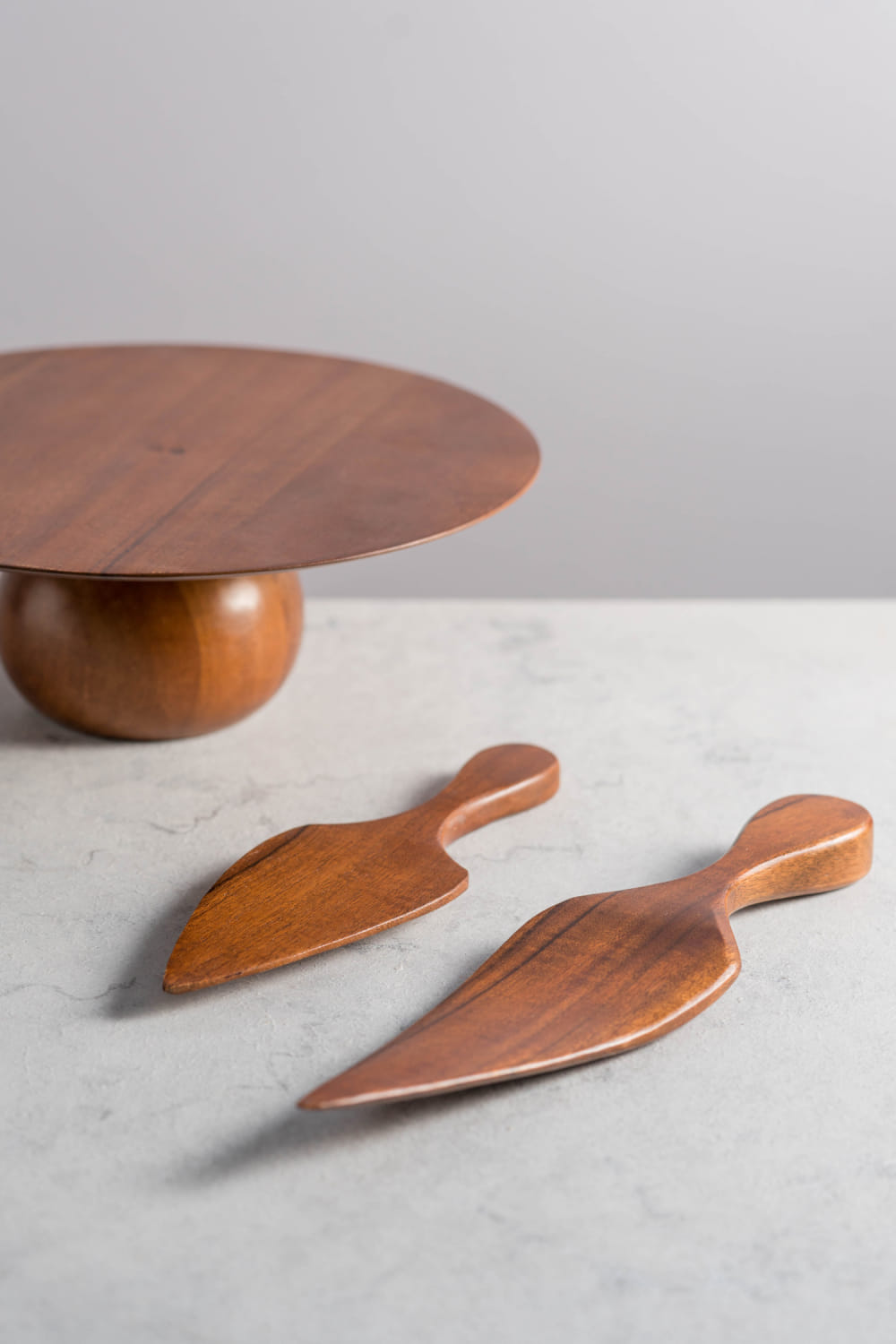 Brown acacia wood cake stand and cutters