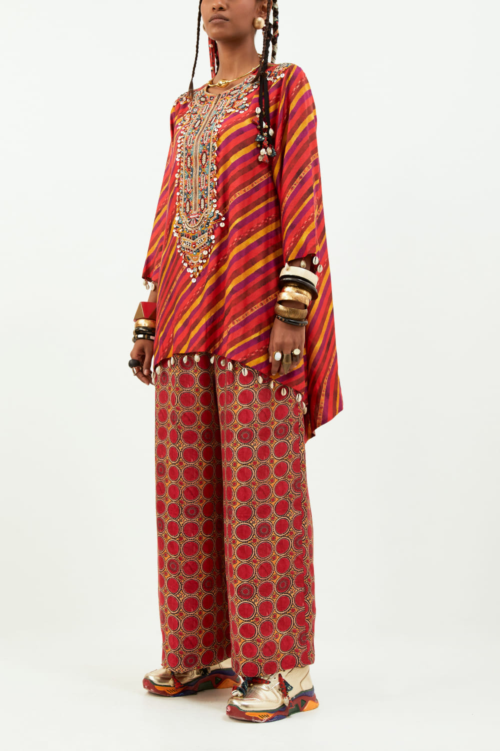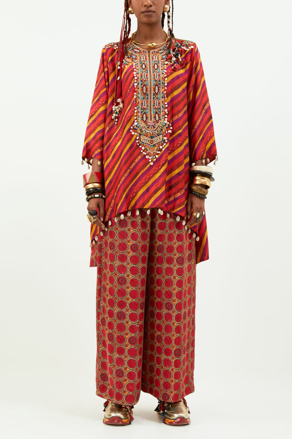 Aseem Kapoor designs this vibrant short kurta crafted in cotton silk enhanced with diagonal stripe prints and boho-inspired embroidery detailing featuring a high low silhouette, teaming it with straight wide-leg pants in circular print. Style the look with silver earrings and embellished slip-ons.