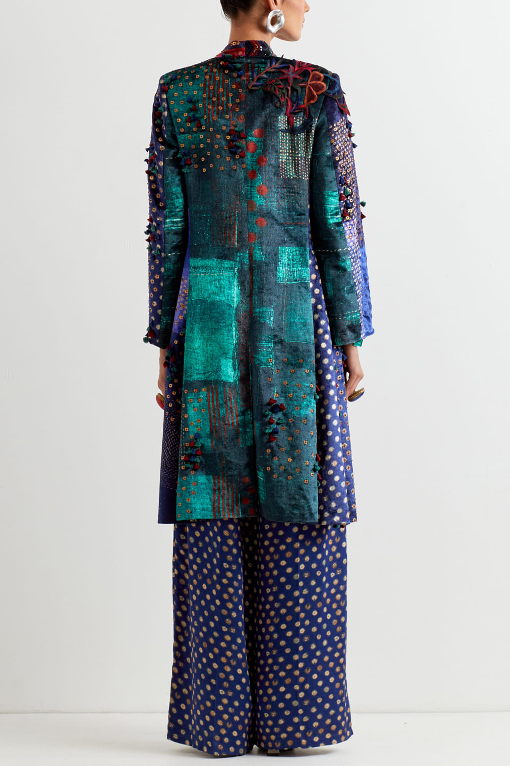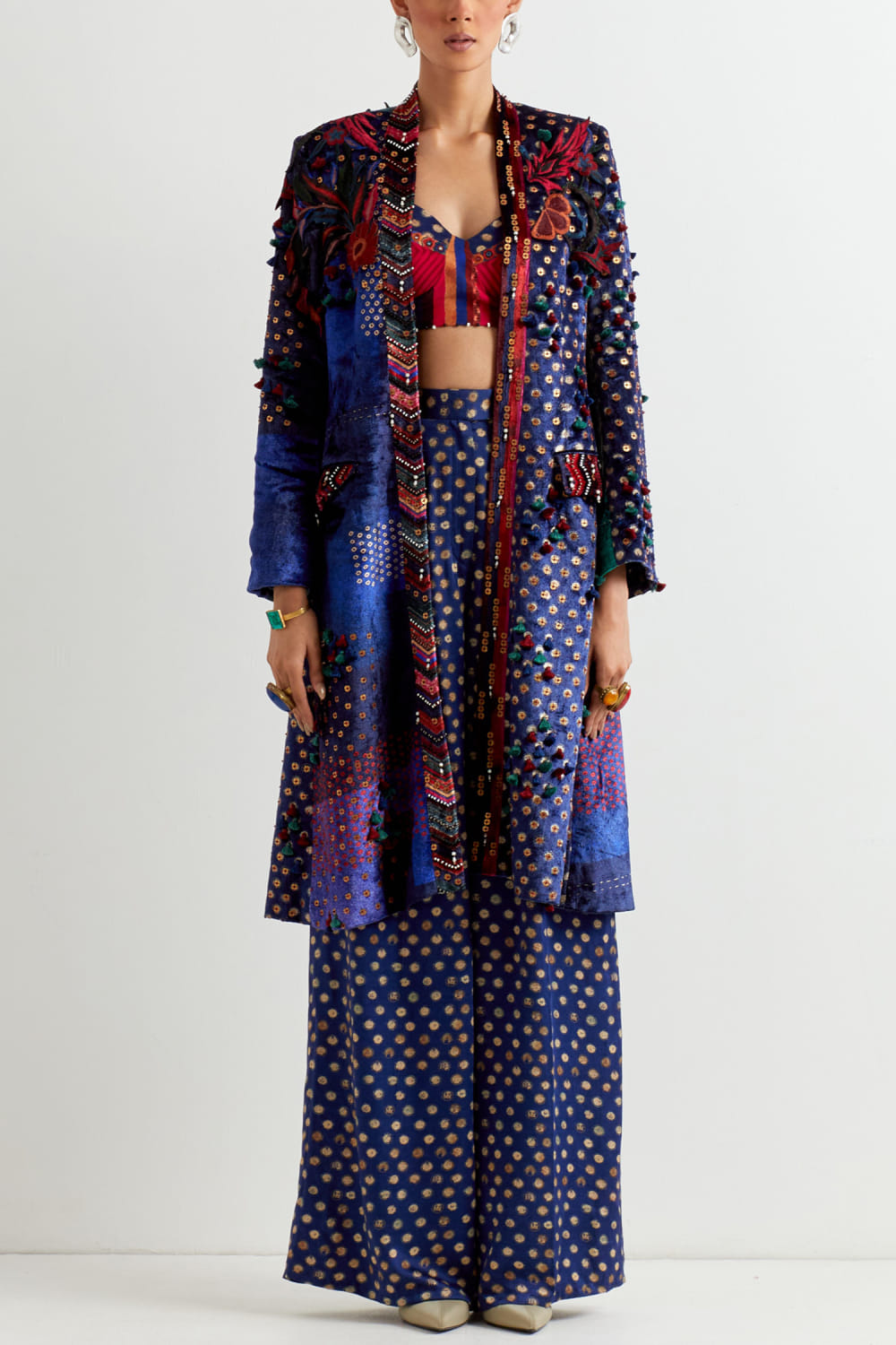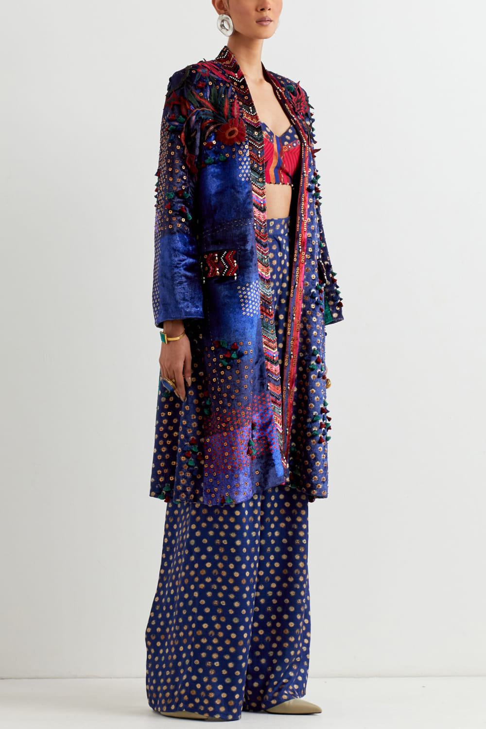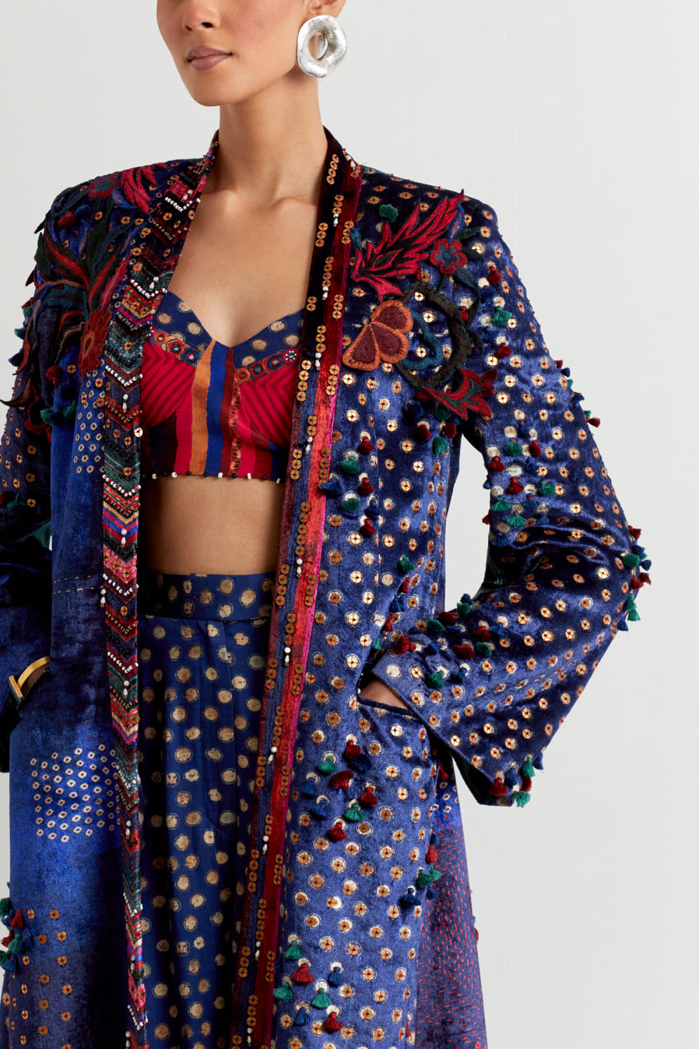 Aseem Kapoor designs this exquisite sapphire blue velvet jacket with cutwork panels and antique metal embroidery. Style it with a bustier and relaxed pants for a statement-making fusion look. The bustier and pants here are shown for styling purpose only.