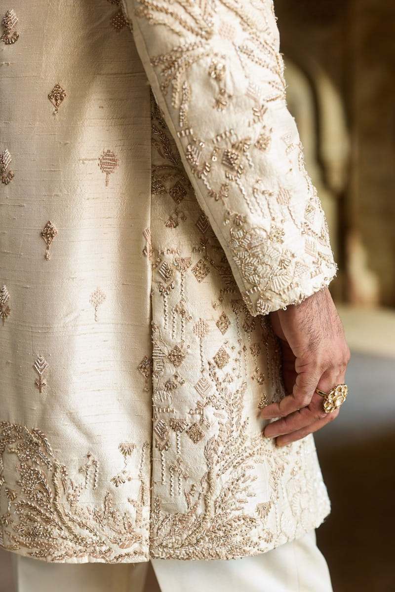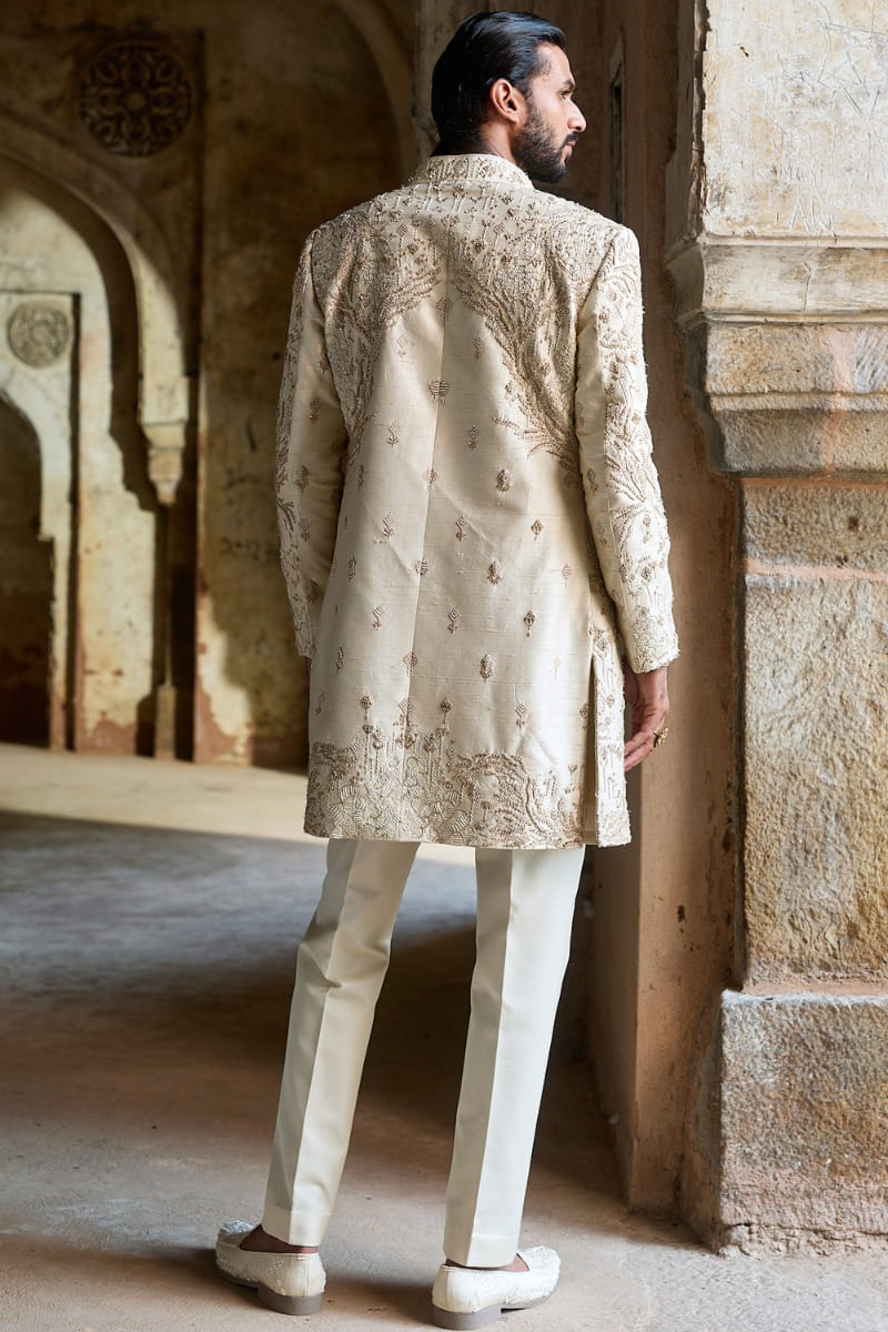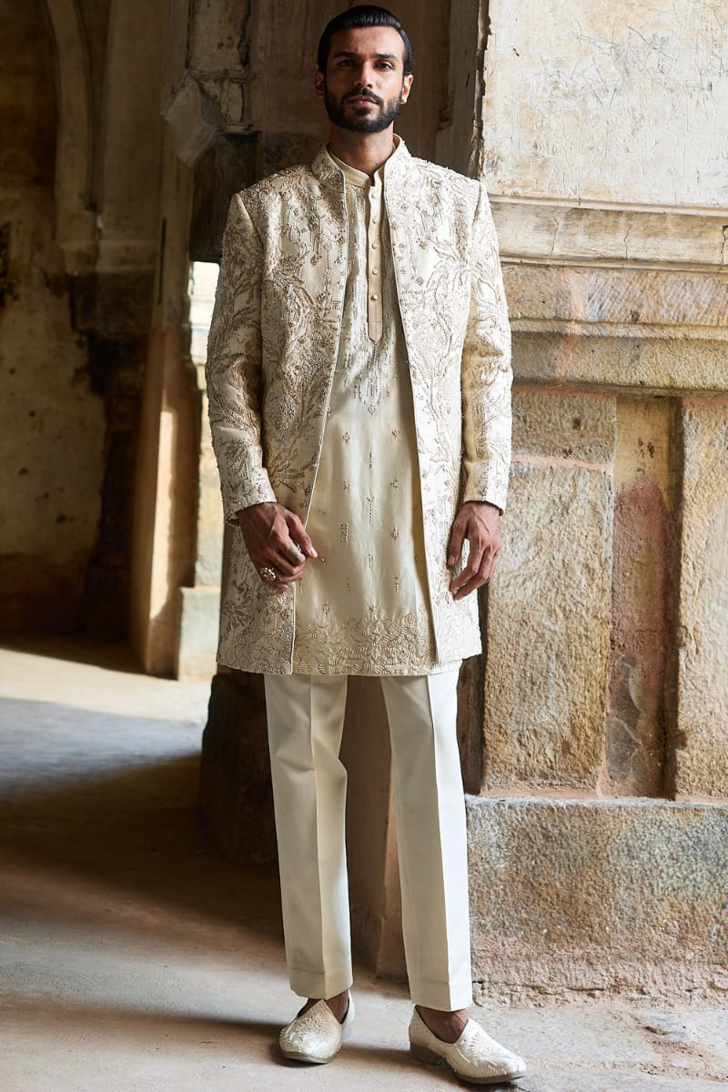 Asuka Couture designs this contemporary Indo-Western set in raw silk. It features dori and resham embroidery embellished with sequins, pearls, dabka and cutdana. It is paired with trousers and a kurta. Style the look with formal loafers for celebratory evenings.