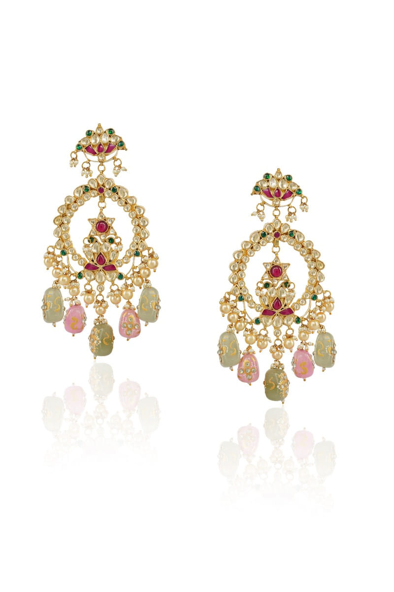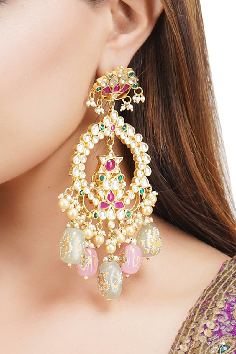 Auraa Trends designs this exquisite pair of chandbaalis customised in 22kt gold plating, embellished with kundan polki and unique beads. Style them with a festive look to add a touch of bling.