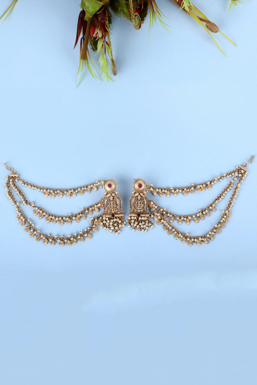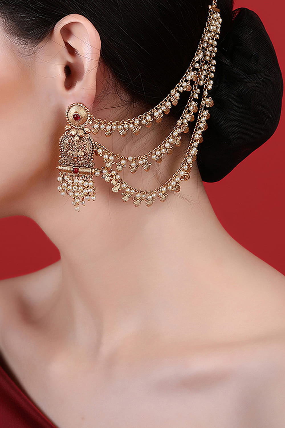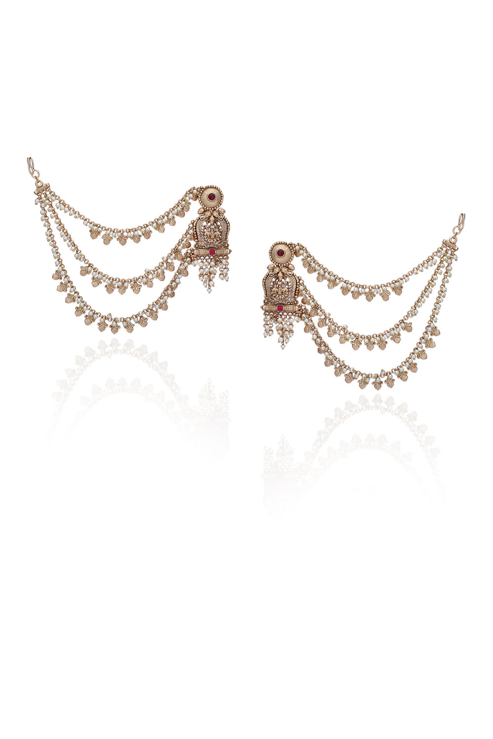 Auraa Trends designs this heirloom-worthy pair of temple earrings enhanced with stone and pearl embellishments and tassel details with attached extensions. Style it with your bridal lehenga for a stylish appeal.