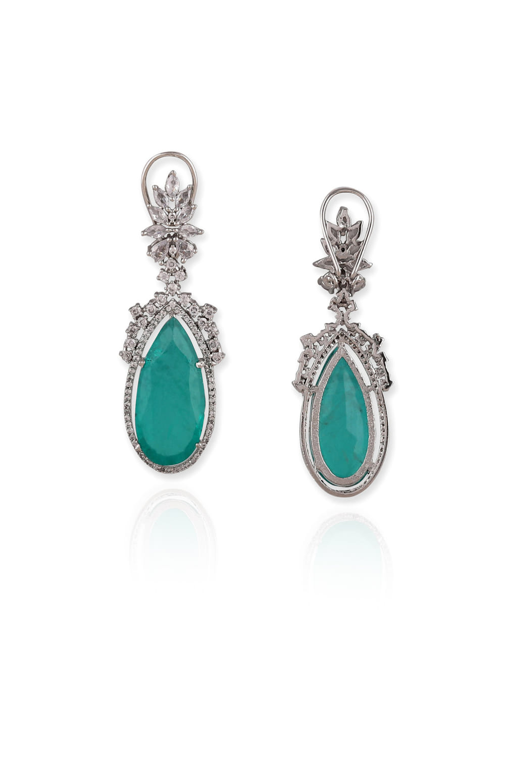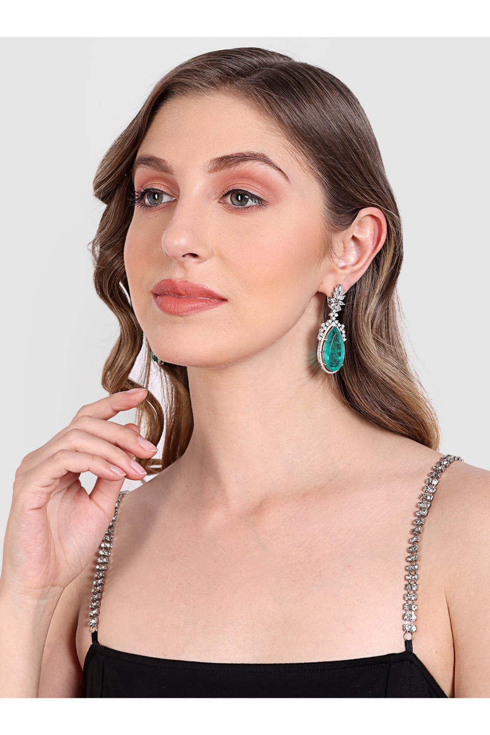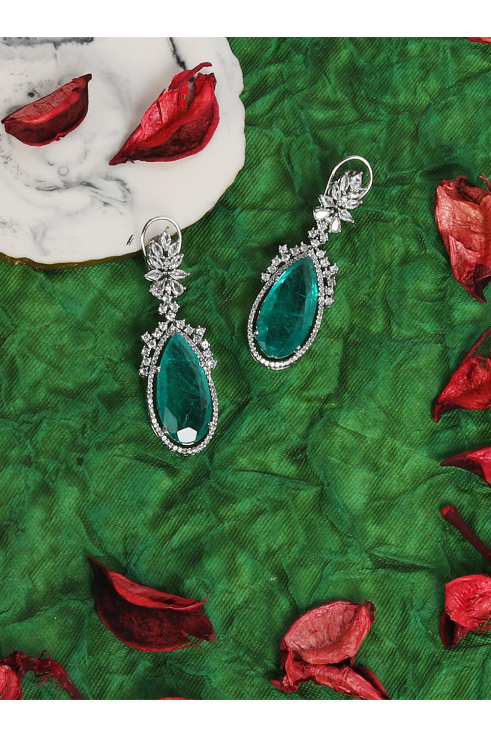 Auraa Trends designs this classy pair of danglers customised in white rhodium-plated alloy with American diamond zircon embellishments. Style them with a cowl dress for a party.