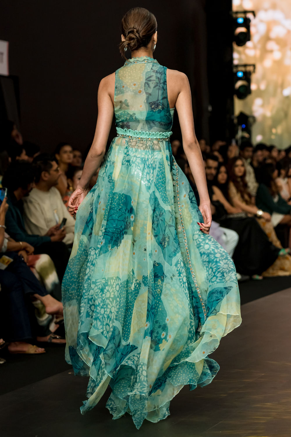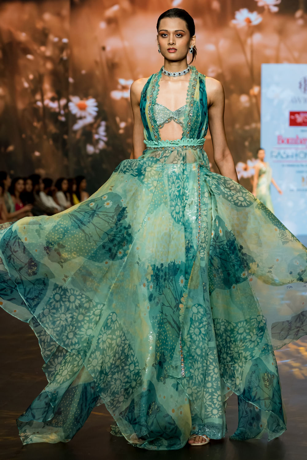 Awigna designs this mesmerizing high-low gown with a floral print and side slit featuring delicate embellishments, teaming it with bustier and sequinned pants. Style the look with embellished hair clip and stilettos for resort soiree.