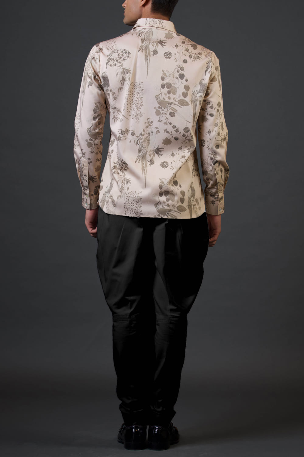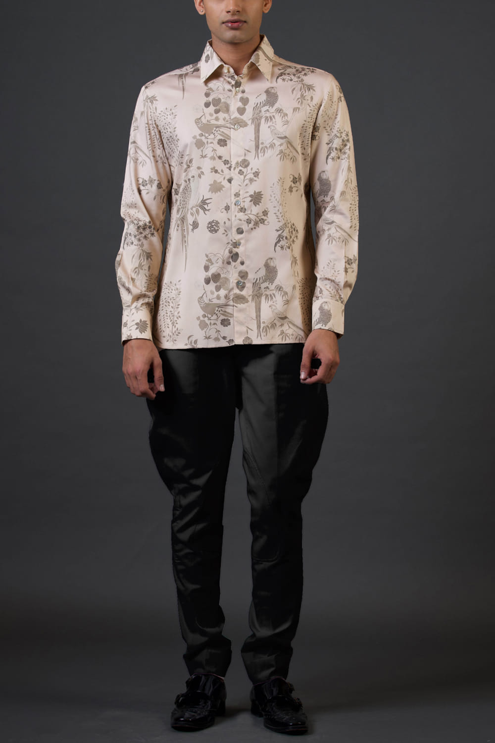 Balance by Rohit Bal designs this charming shirt embraced in poplin satin with digital floral and bird prints. Style it with black pants and leather lace-up shoes. The pants here are shown for styling purposes only.