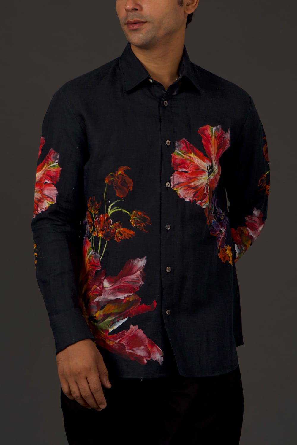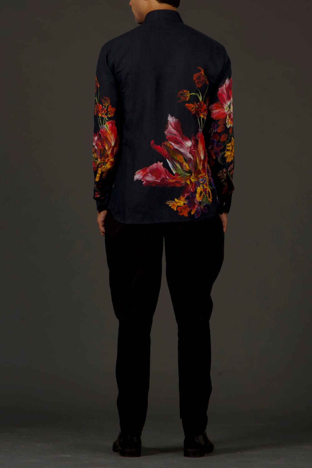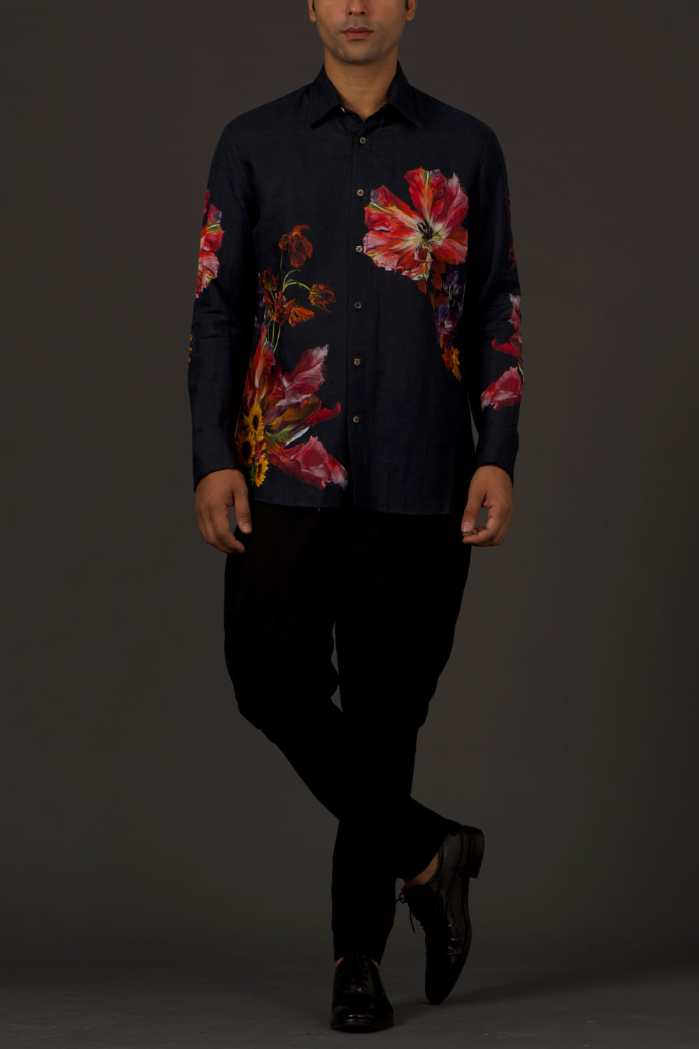 Rohit Bal designs this stunning button-down shirt, featuring an eye-catching hibiscus floral print pattern. Style it with leather shoes. The pants are shown for styling purpose only.