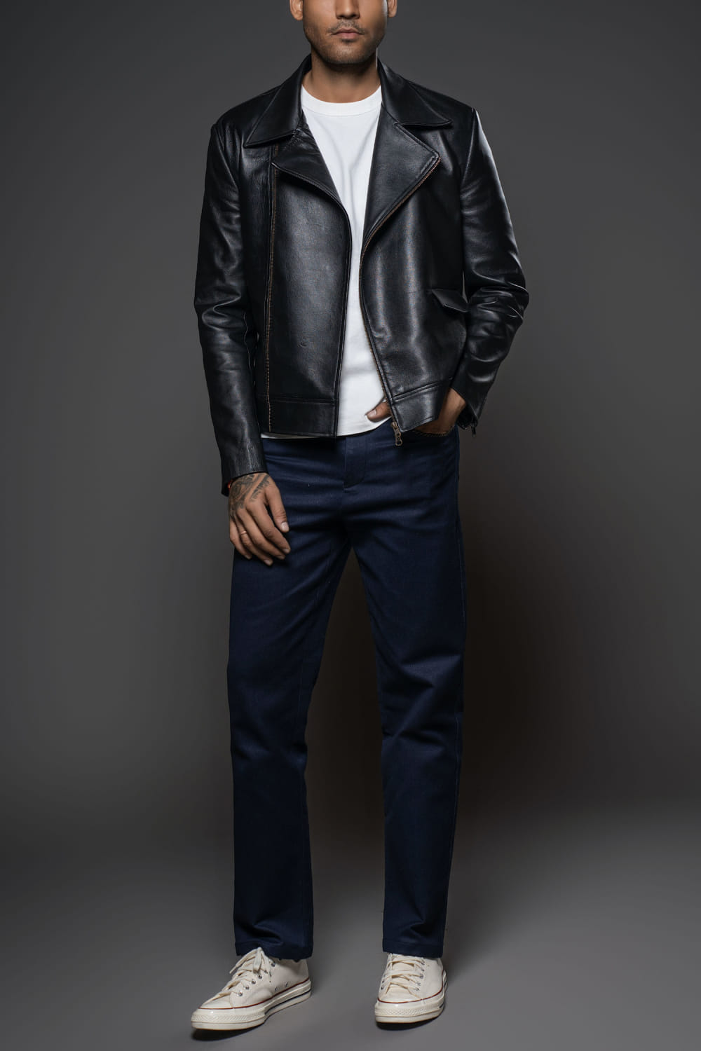 Balance by Rohit Bal designs this ultra-cool jacket crafted in leather with zip and flap detailing. Style it with a graphic tee and leather pants for an edgy look. The top and pants here are shown for styling purposes only.