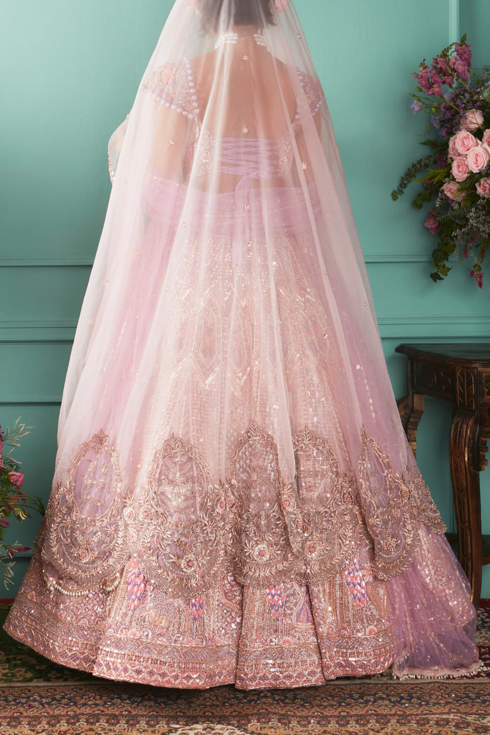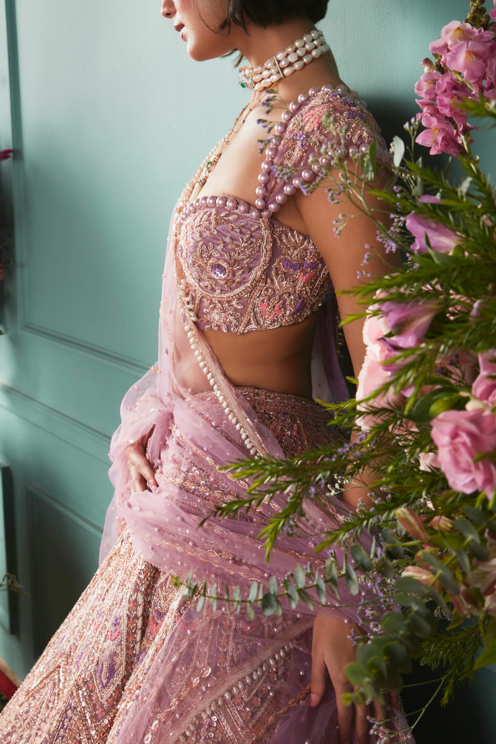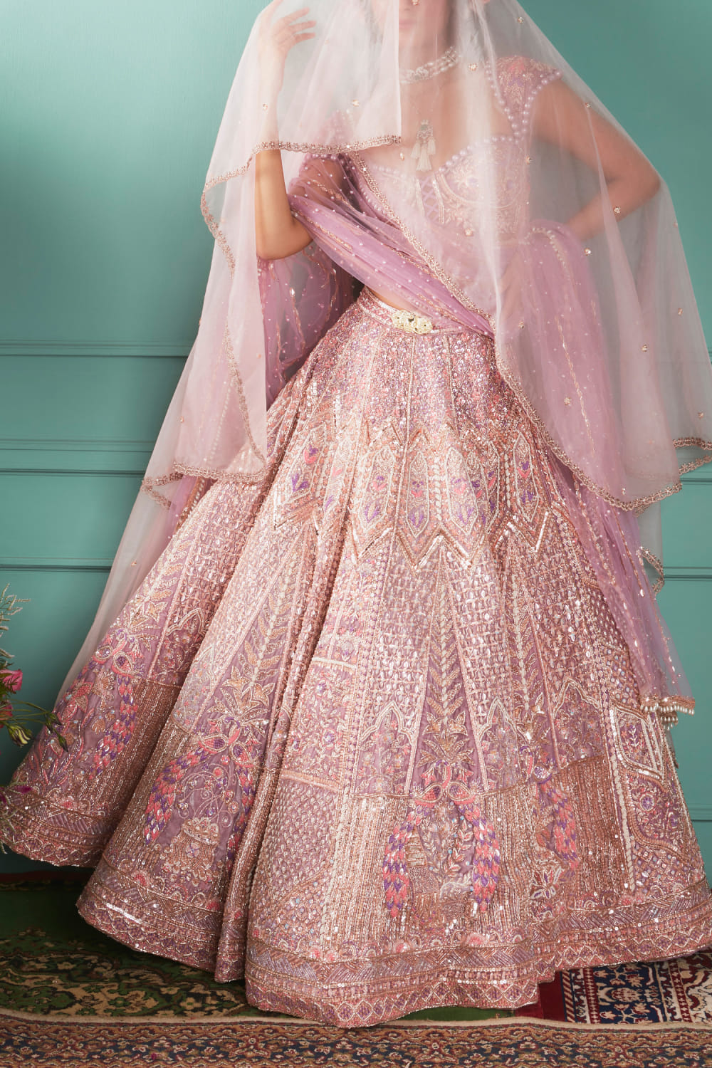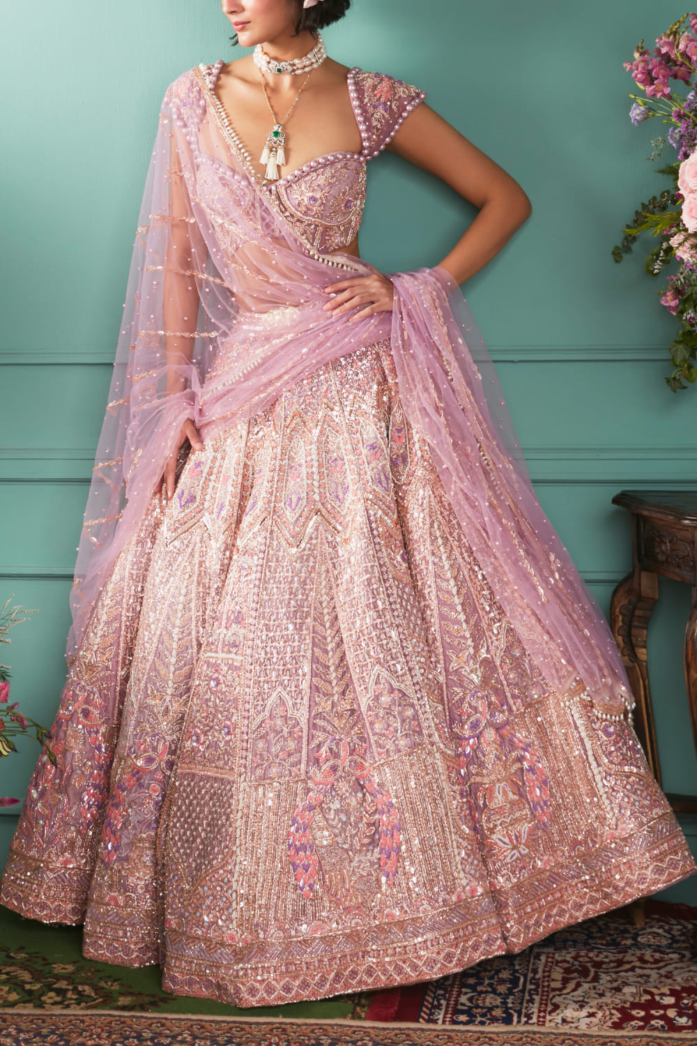 Jigar & Nikita designs this mesmerising lehenga crafted in velvet with intricate French knot work, mukaish work and zardozi hand embroidery detailing, complementing the look with an ornate corset-style blouse and a net dupatta. Style the look with a pearl polki choker set and stilettoes for the sangeet ceremony.
