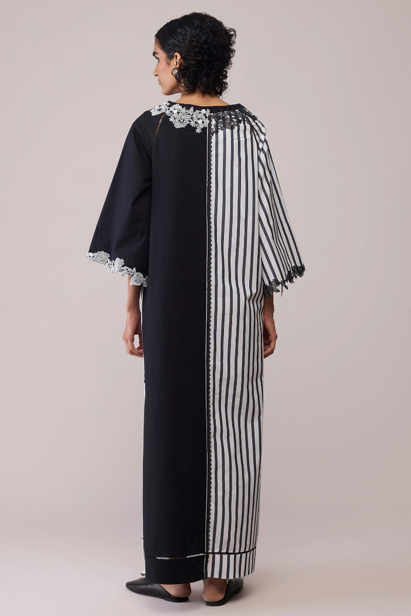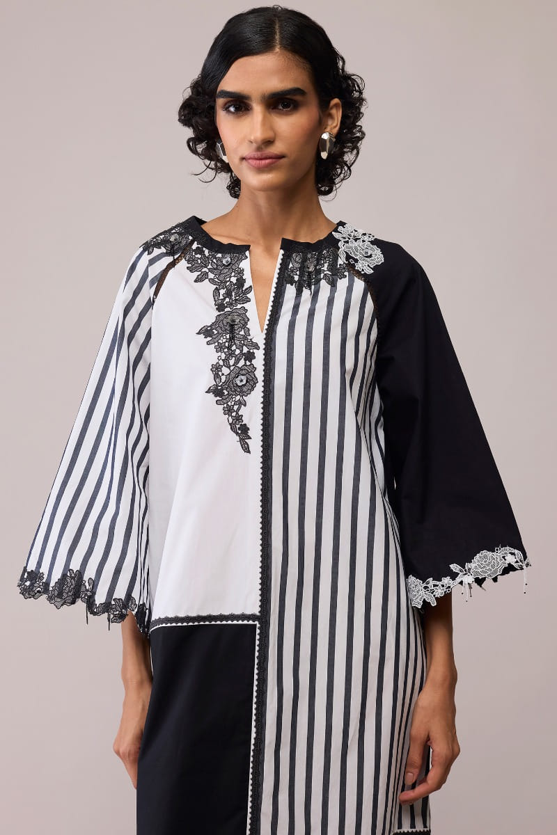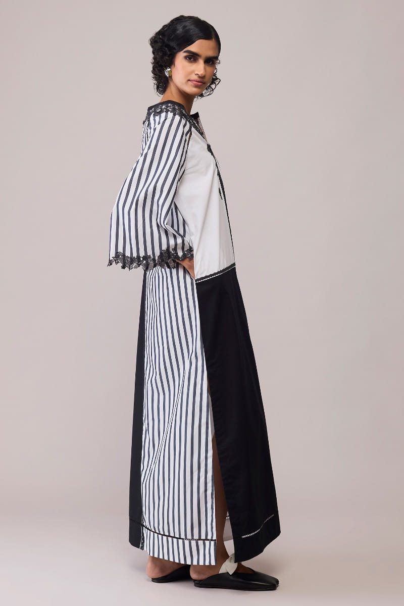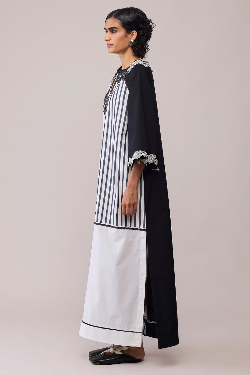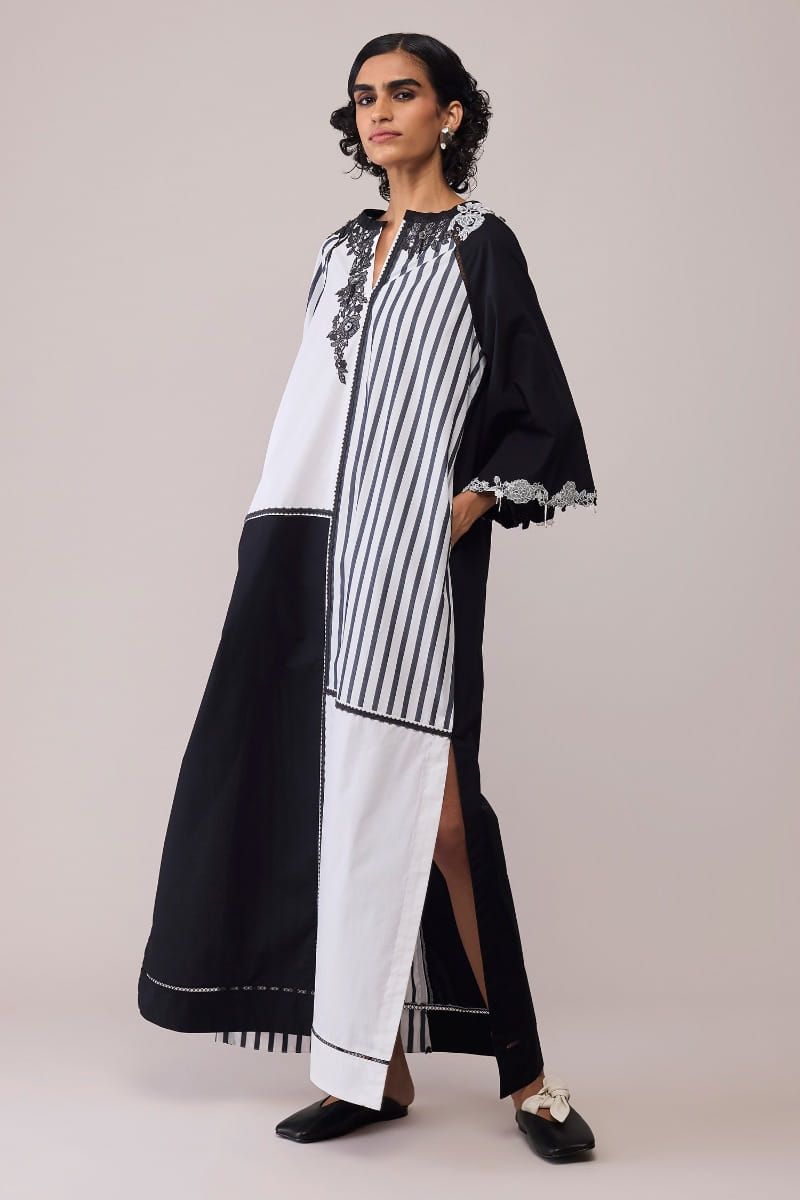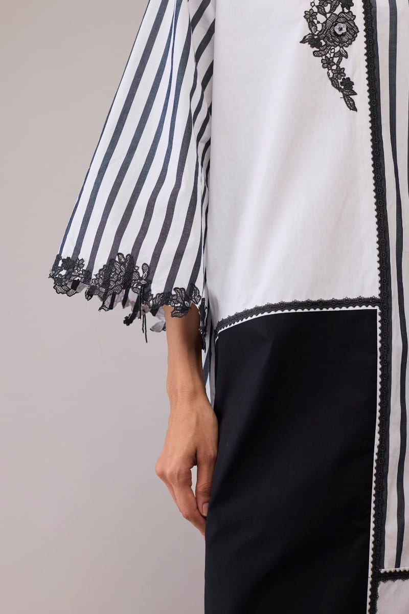 Bunka designs this artistic monochrome dress crafted in soft cotton with a play of striped and solid panels. Lace embroidery along the neckline and sleeves adds a romantic accent to its structured ease. Style it with statement earrings and heels for modern elegance.