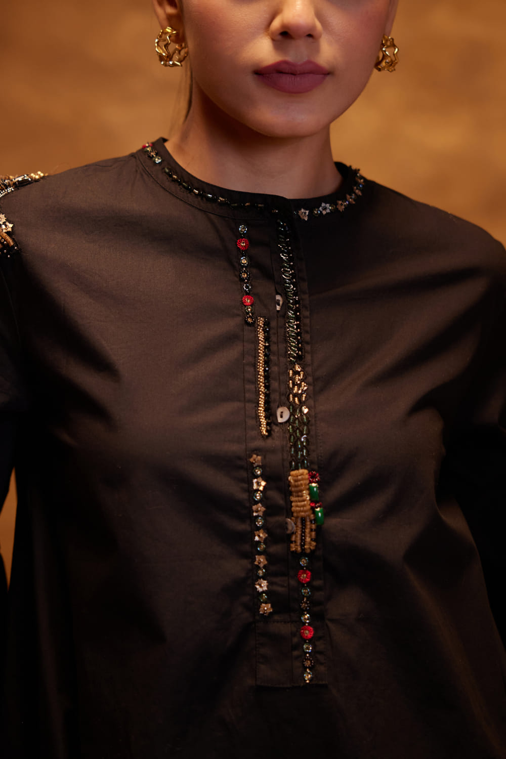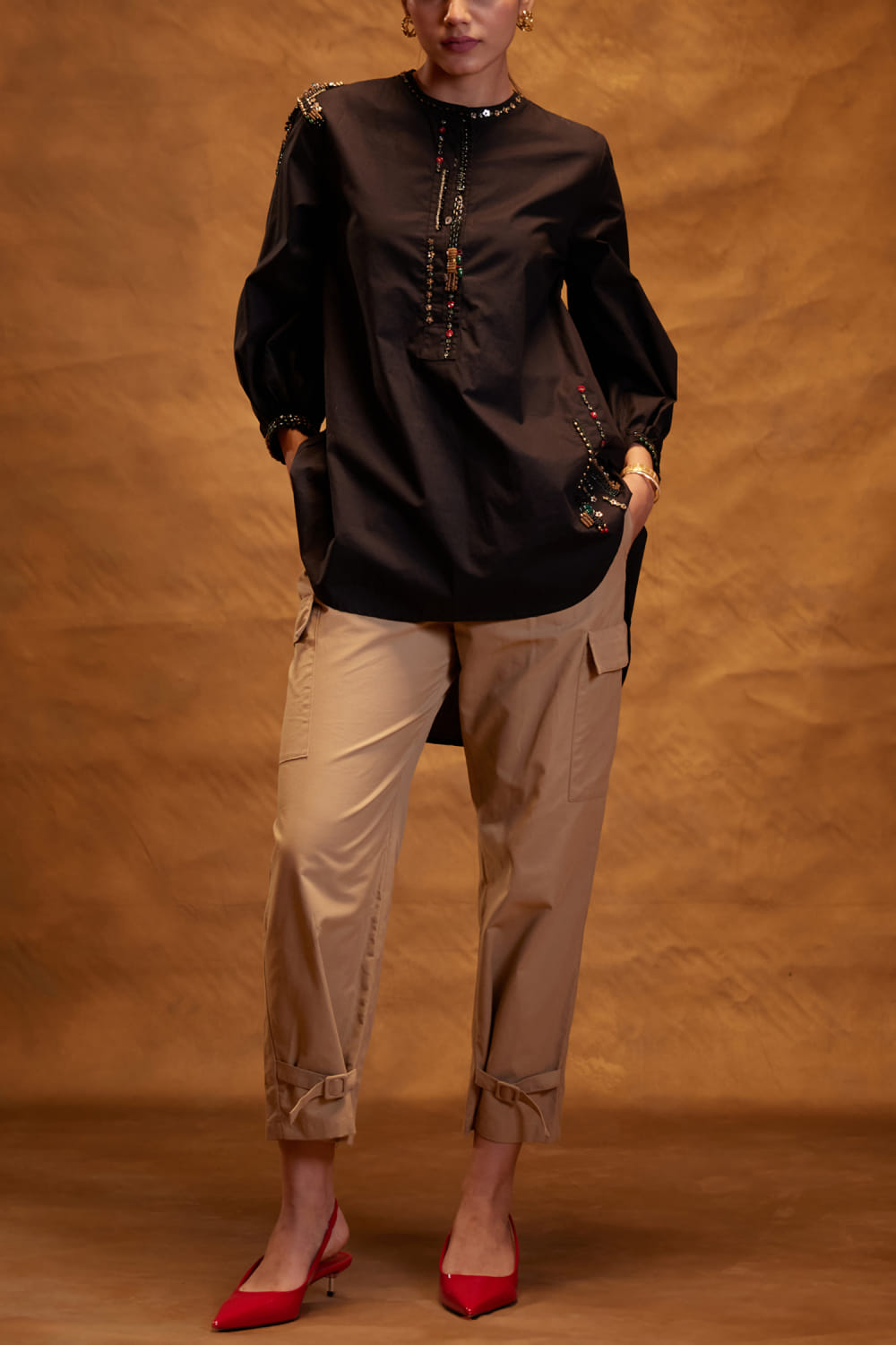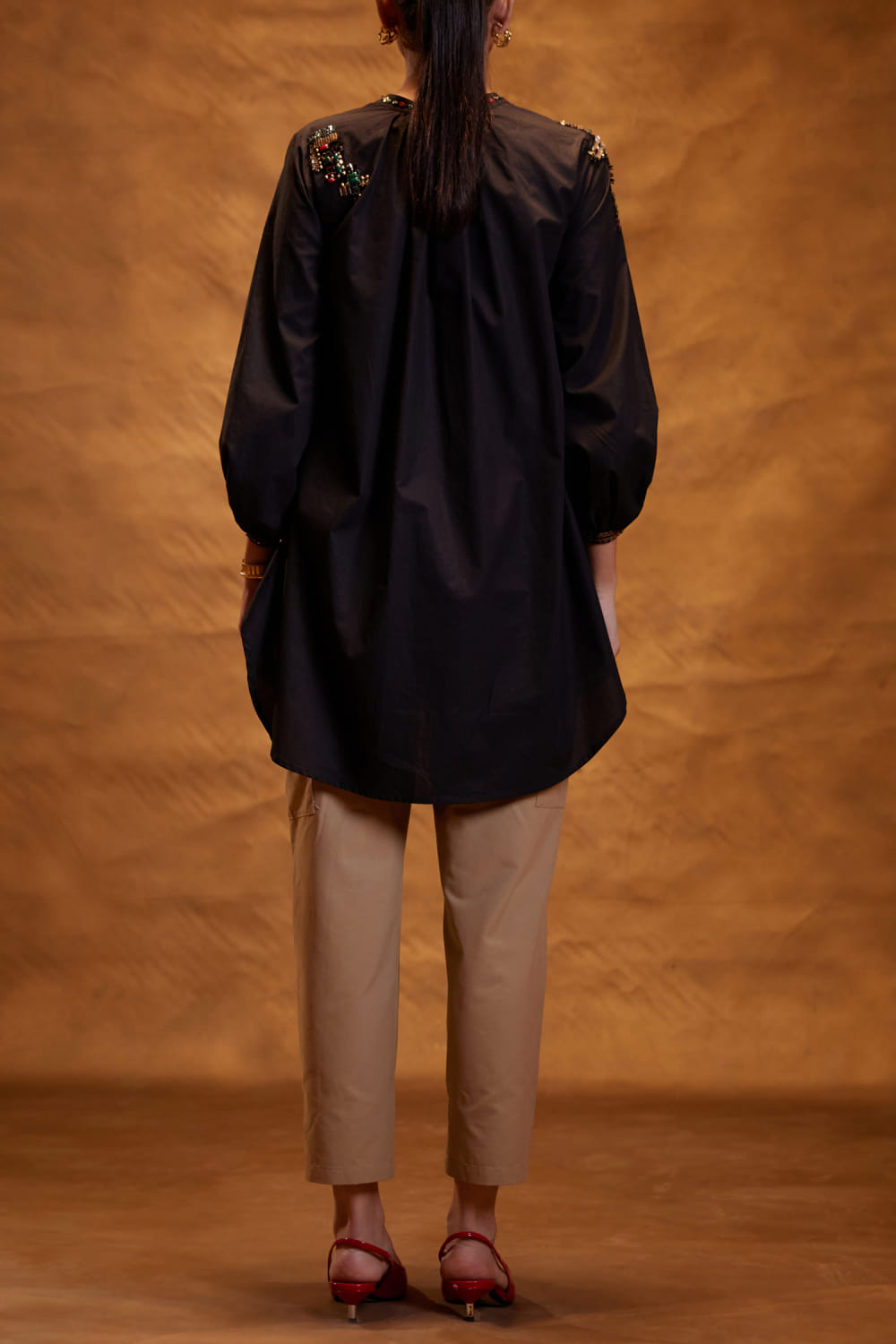 Bunka designs this distinctive tunic crafted in cotton poplin with beads and sequins hand embroidery detailing in aztec-inspired patterns featuring an asymmetrical hem in a relaxed oversized fit. Style it with contrasting pants and mules for a casual appeal. The pants here are shown for styling purposes only.
