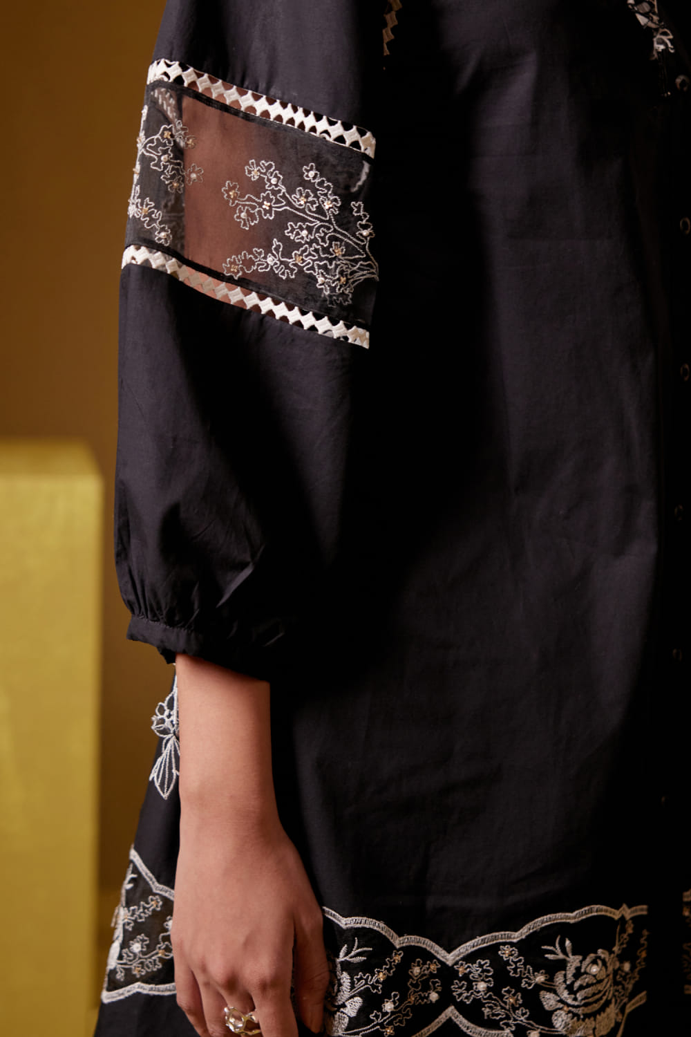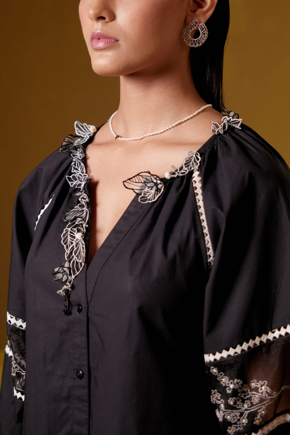Bunka designs this charming front-open tunic rendered in cotton poplin with balloon sleeves, buttons, 3D organza floral and leaf accents, contrasting lace, scalloped hem and embroidery detailing in floral patterns featuring a relaxed A-line fit. Style it with a sling bag and matching pants for a weekend brunch.
