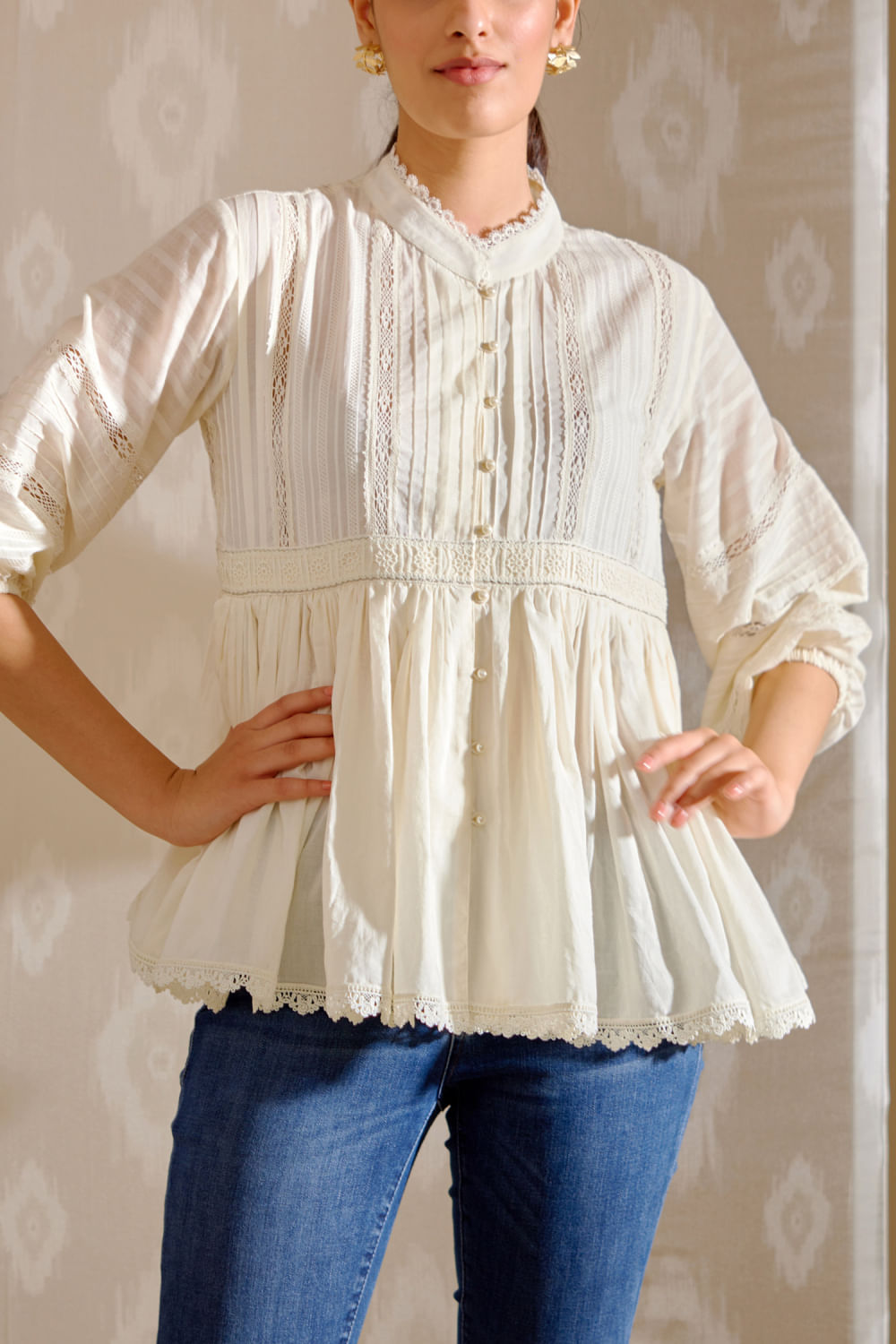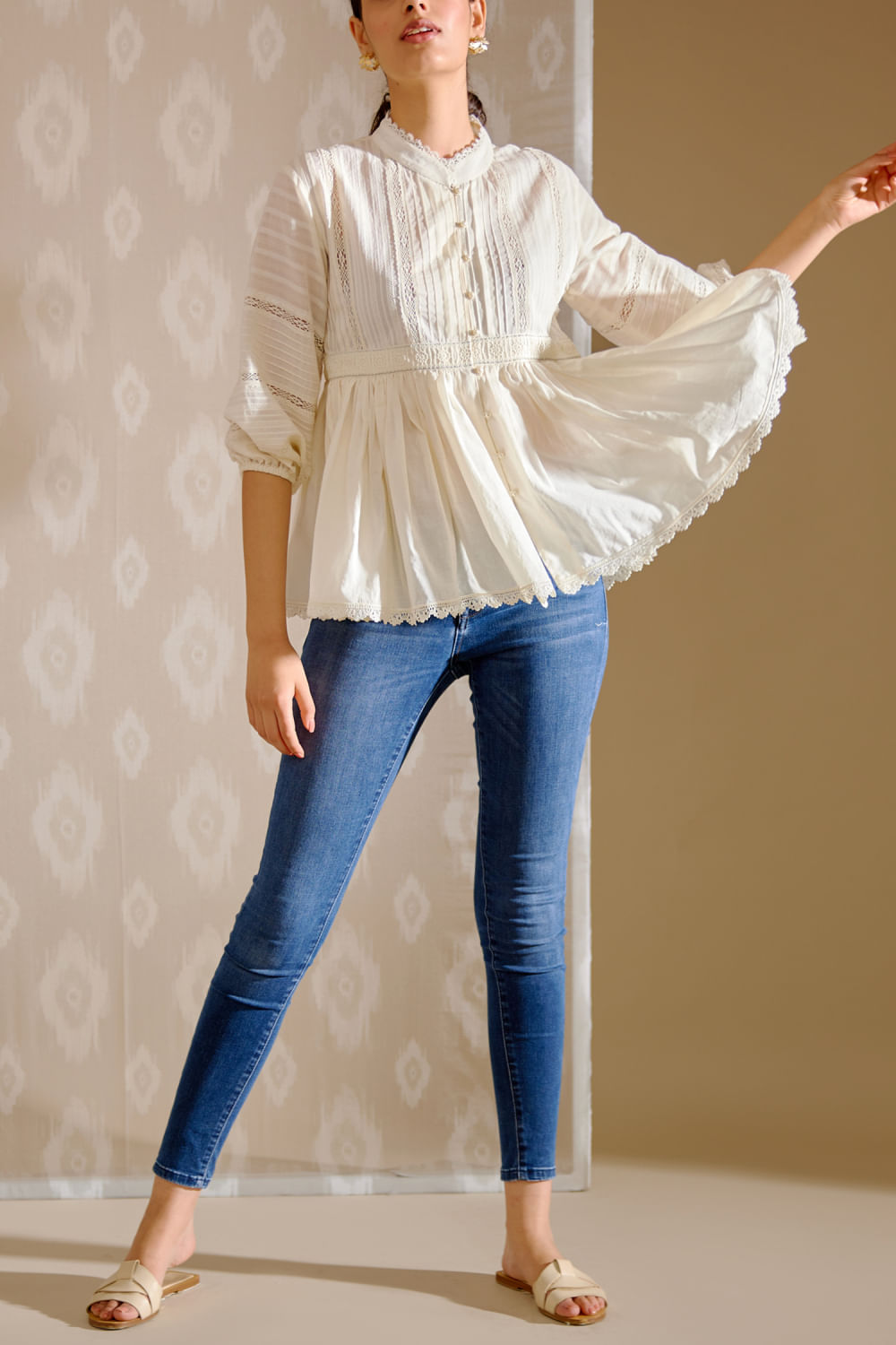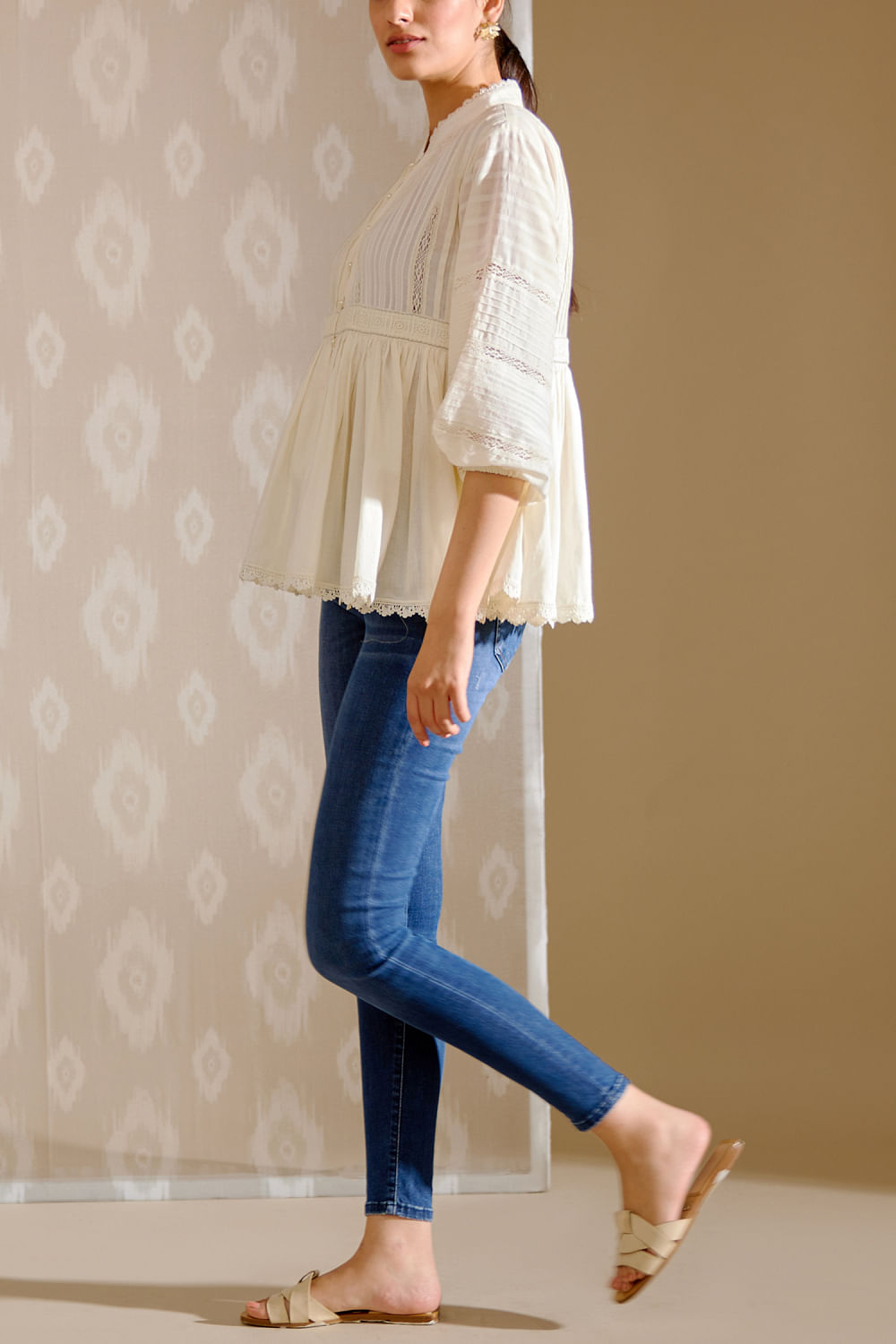 Bunka designs this summer-ready fit and flared top rendered in cotton voile with elasticated sleeves, a chinese collar, buttons, pintucks and crochet lace detailing. Style it with a palazzo and a sling bag for a weekend brunch. The pants here are shown for styling purposes only.