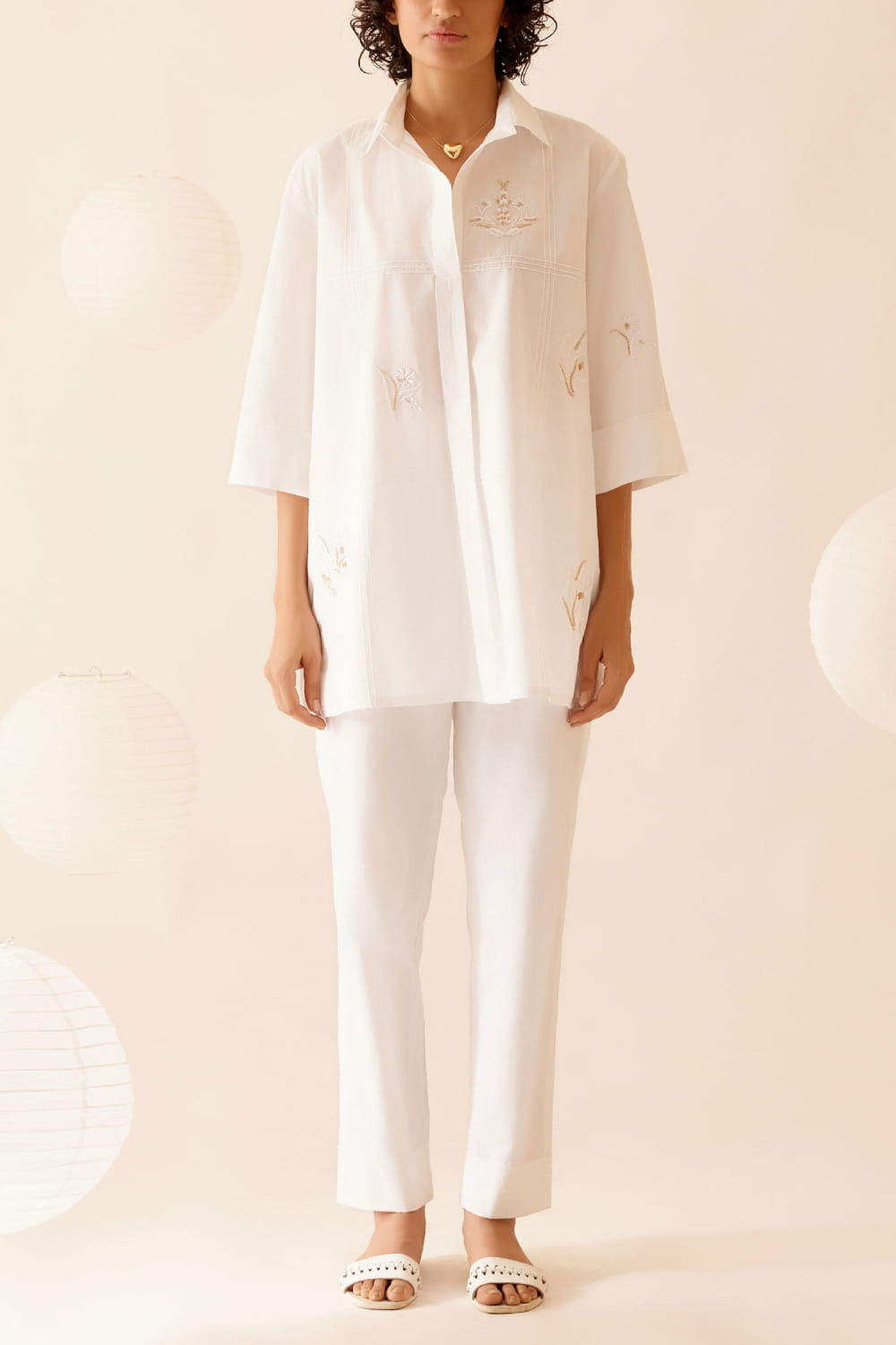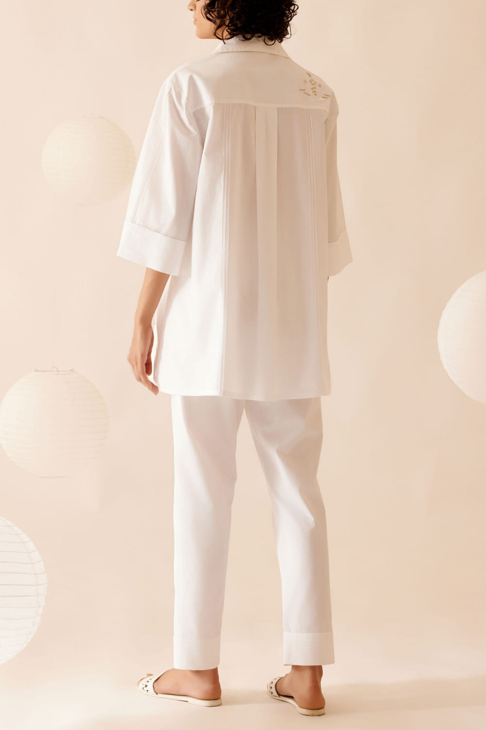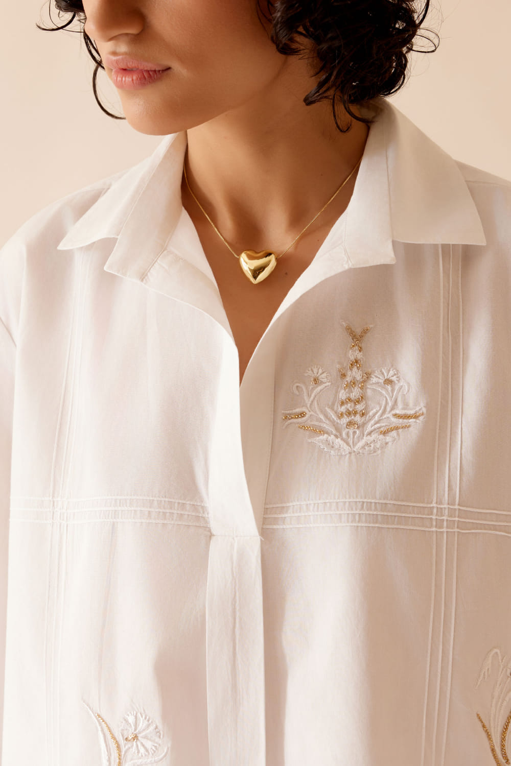 Bunka desings this stunning shirt-style top crafted in cotton poplin with delicate hand-embroidery in chintz-inspired floral motifs and pintuck detailing featuring a shirt collar in an A-line fit. Style it with matching pants and strappy heels for a mesmerising appeal. The pants here are shown for styling purposes only.