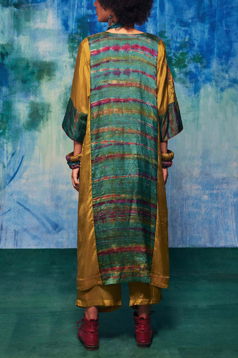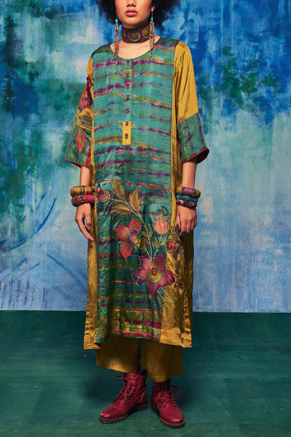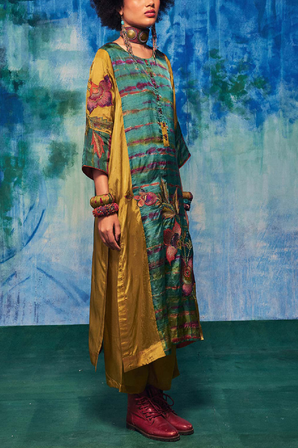 Capisvirleo designs this graceful kurta crafted in silk with tie-dye panel kurta featuring applique embroidery, teaming it with pants. Style the look with an embellished danglers and stilettos for a classic appeal.