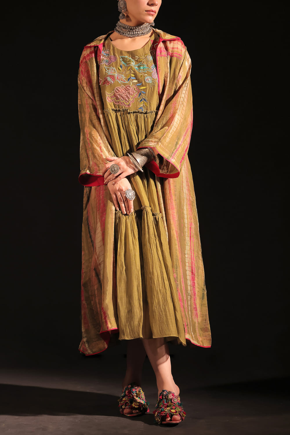 Capisvirleo designs this idiosyncratic shirt-style jacket customised in habutai silk with tie-dye prints. Style it with a bustier and palazzo for a fusion look. The dress here is shown for styling purposes only.