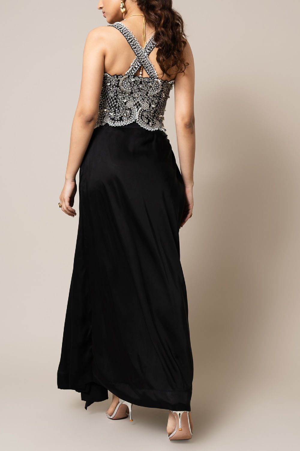Nupur Kanoi designs this enchanting corset crafted in crepe with stud embellishments, Swarovski, mirror work, metallic sequins and pearl hand embroidery featuring scalloped edges and detailing, teaming it with an asymmetric gathered skirt. Style the look with a cuff bracelet and spiked earrings for an occasion.