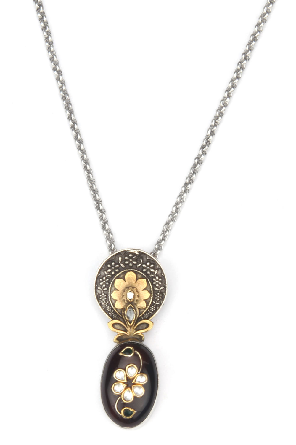 Sangeeta Boochra designs this occasion-ready pendant necklace embraced in 24k gold-plating laden with labradorite and kundan embellishments featuring intricate detailing and inlay work in floral motifs. It comes with a long silver chain. Style it with a mini dress and a capsule clutch for a captivating appeal.