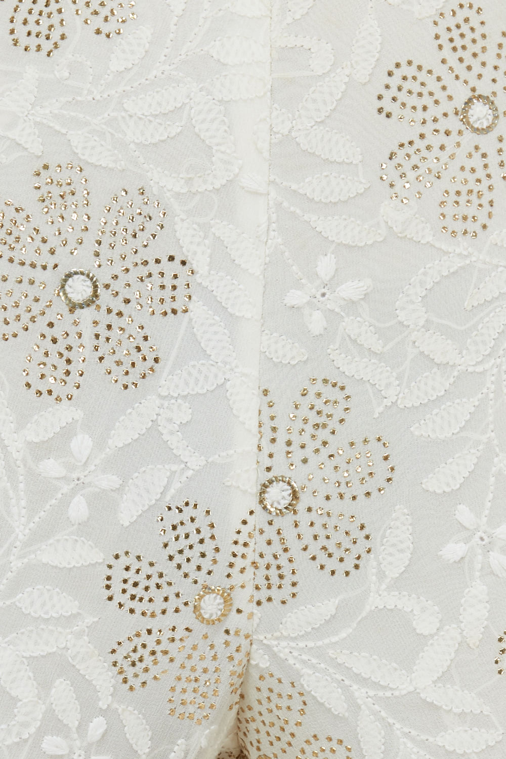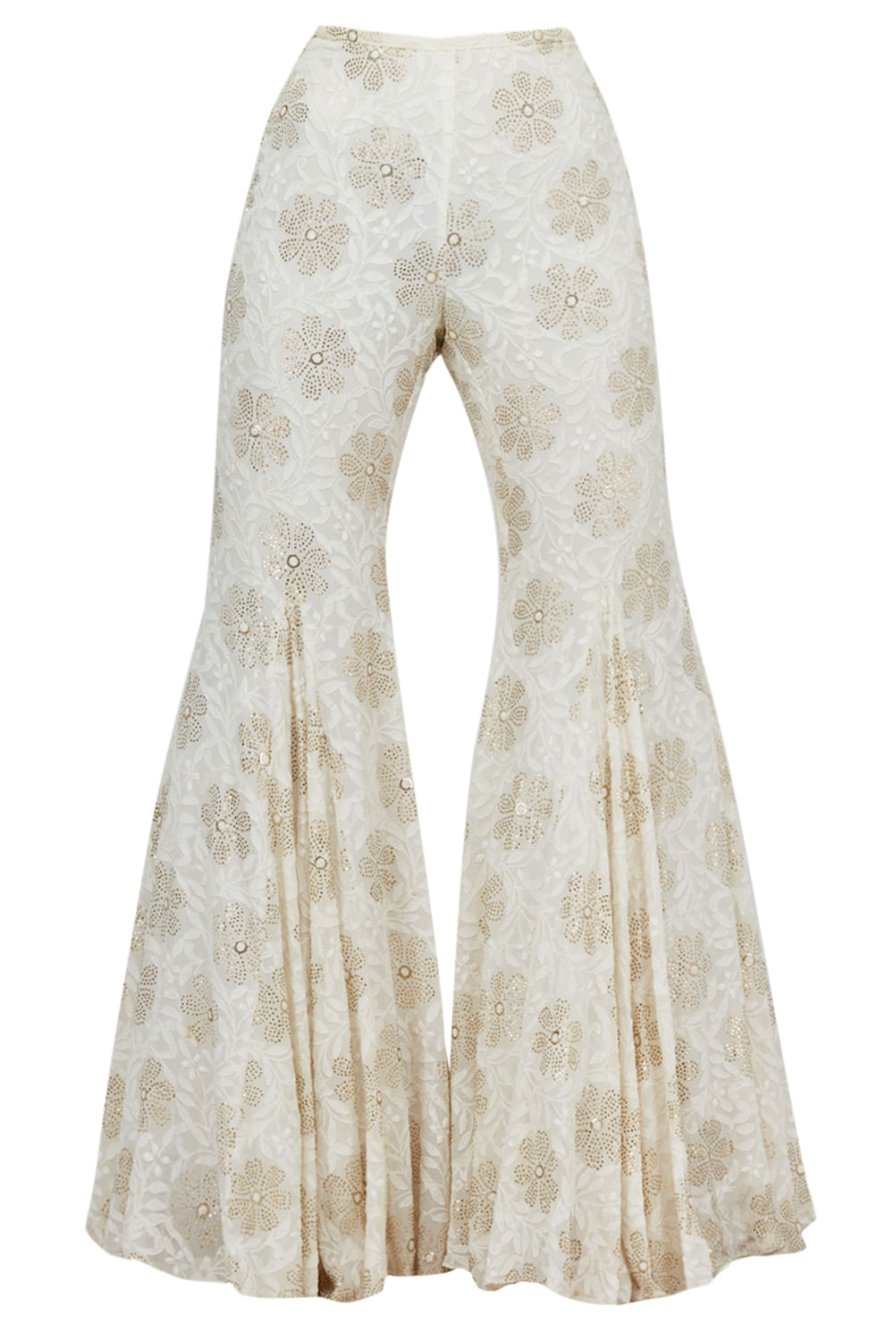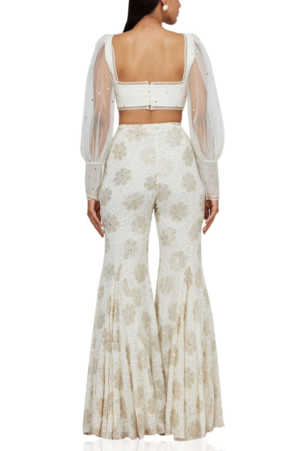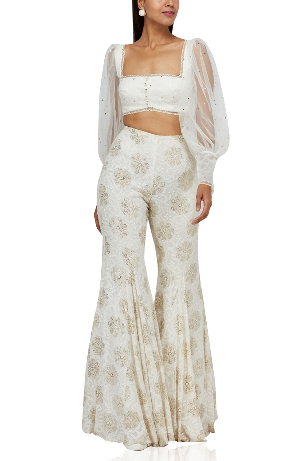 Shehlaa Khan designs a retro-inspired look with this tulle top paired with lace-accented shararas. Style the look with a potli bag.