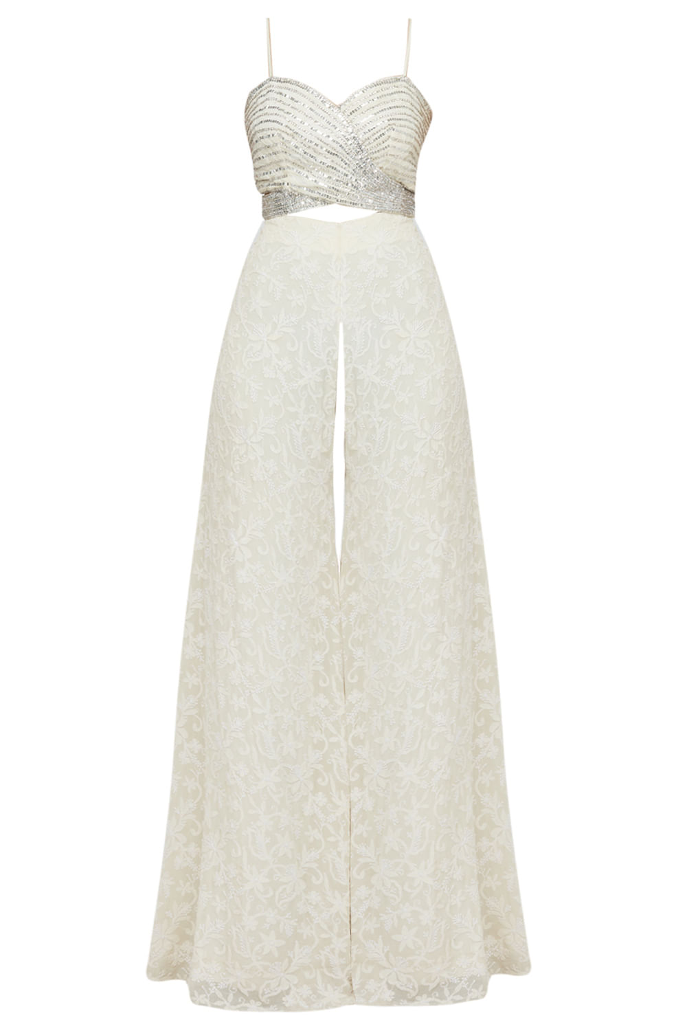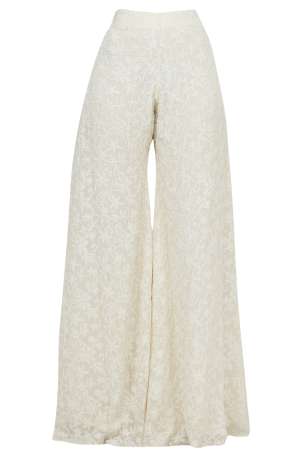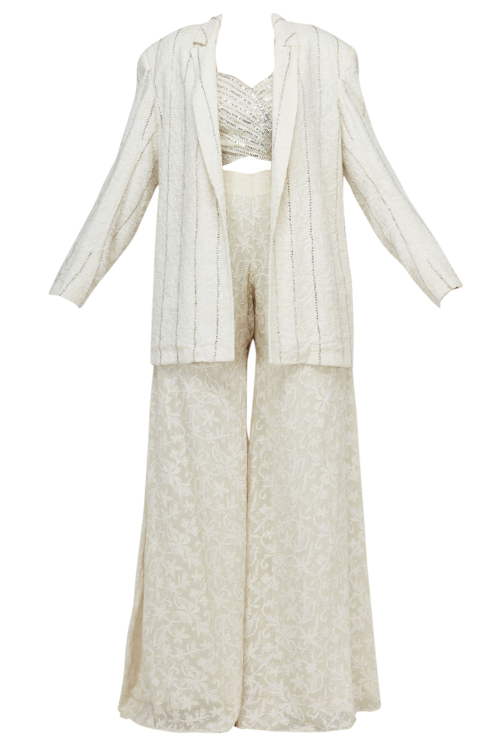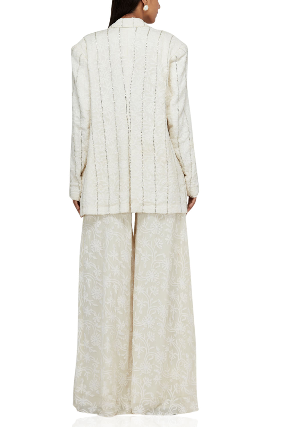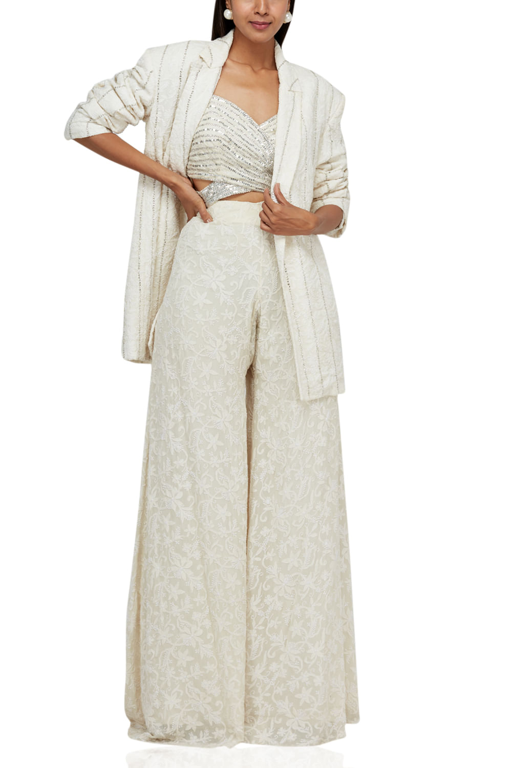 Shehlaa Khan designs a stunner styling this blouse and palazzo with chikankari embroidered jacket. Style the look with a choker necklace.
