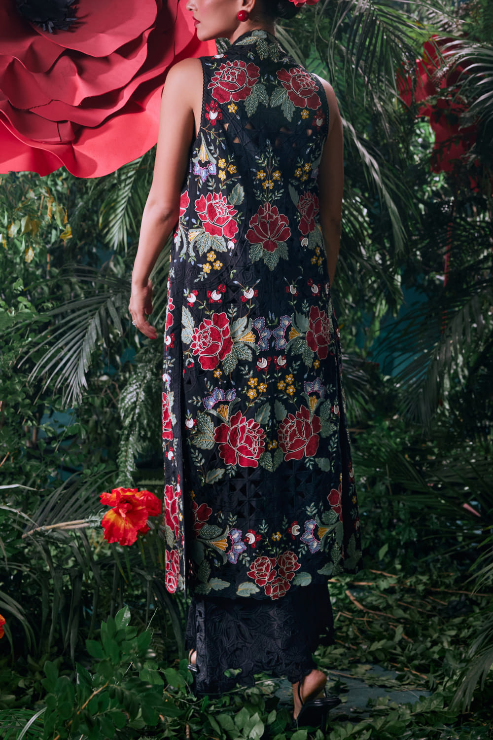 Chandrima designs this endearing sleeveless jacket crafted in kala cotton with multicolour floral embroidery detailing in beads, applique and cutwork detailing. Style it with co-ords for an evening party. The top and pants here are shown for styling purposes only.