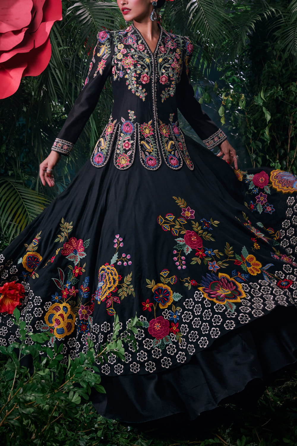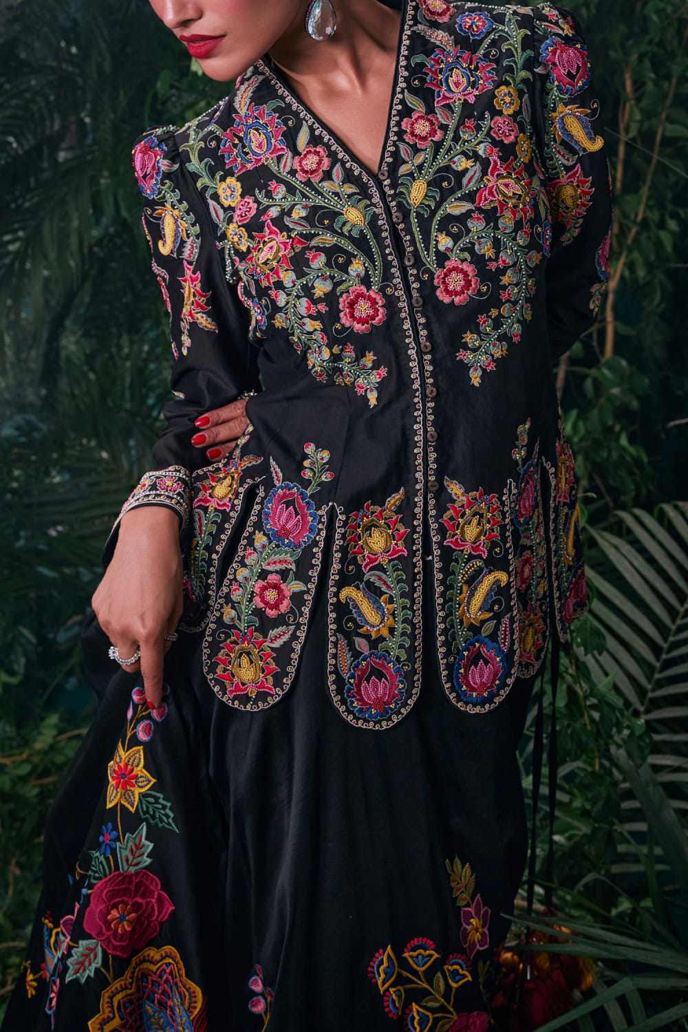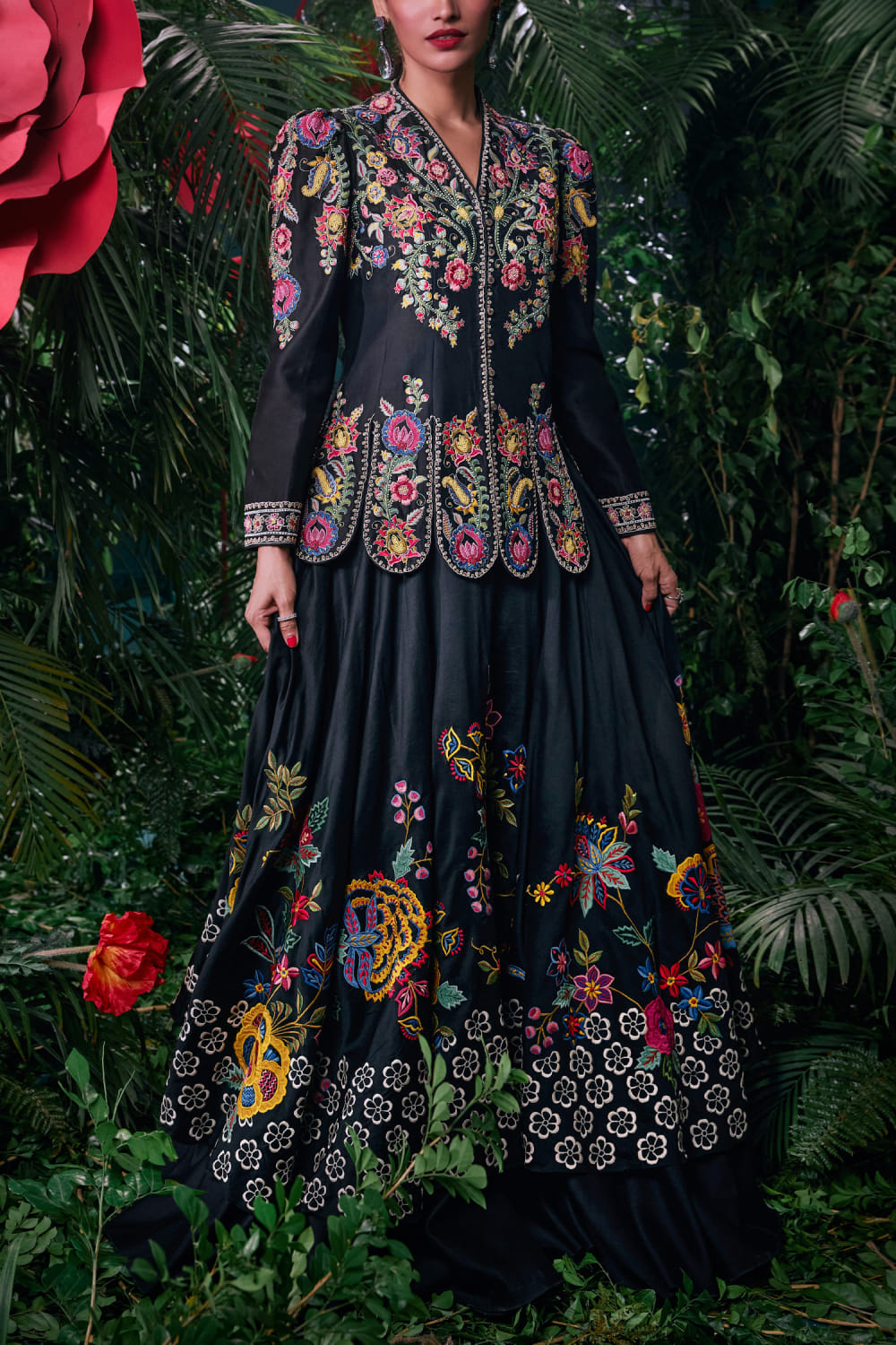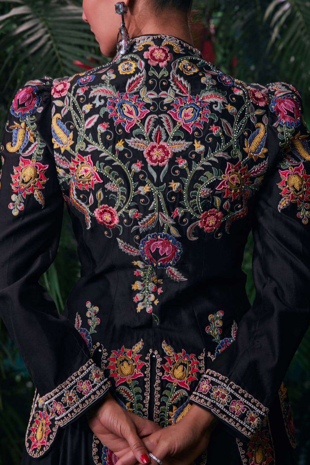 Chandrima designs this classy peplum jacket in chanderi enriched with floral embroidery detailing in threadwork, beads and cutwork. Style it with polki jhumkas for the party. The skirt here is shown for styling purposes only.